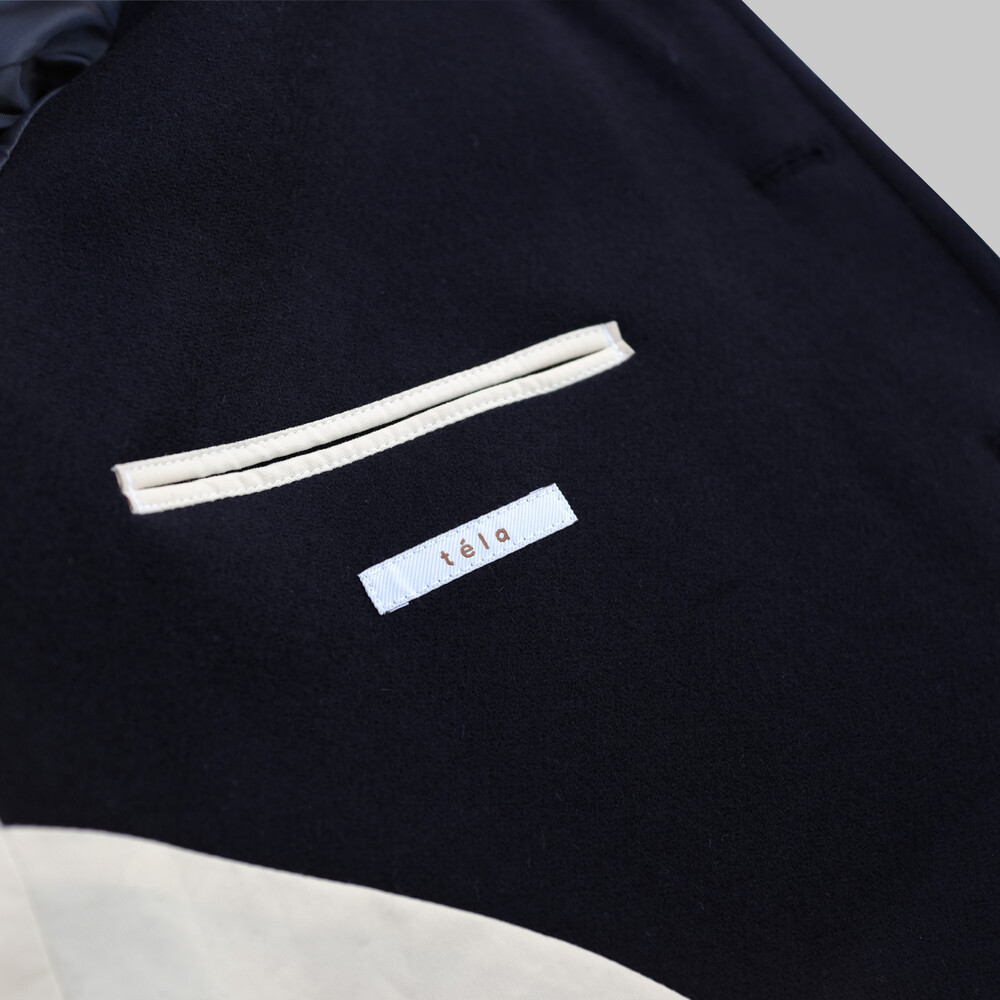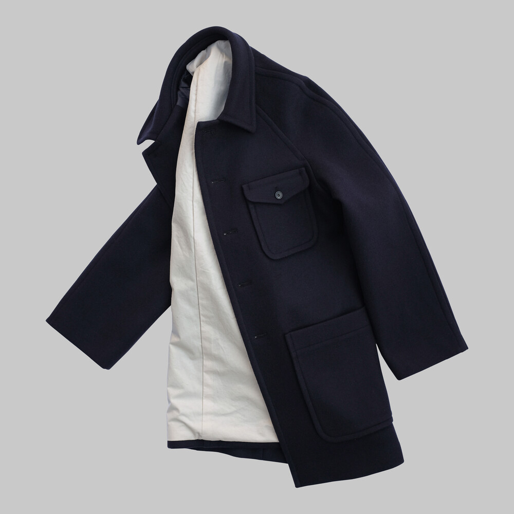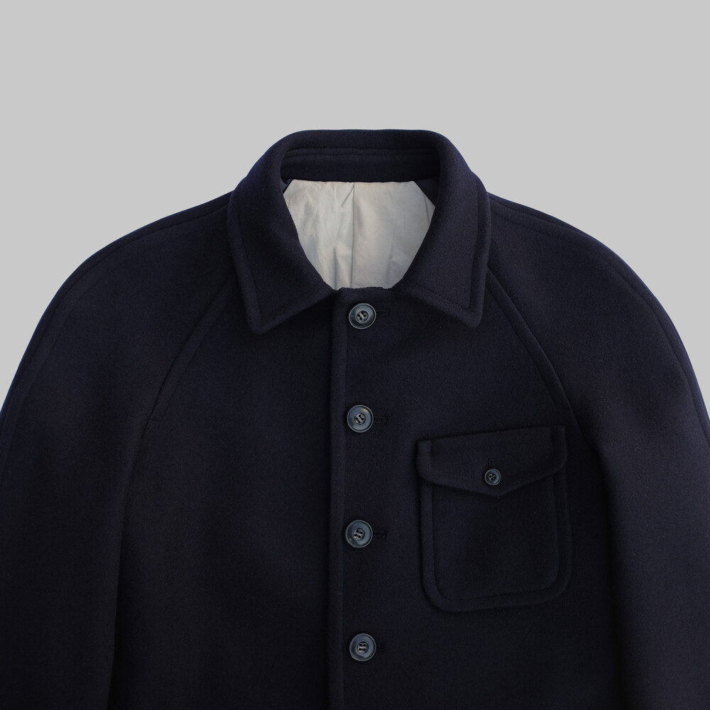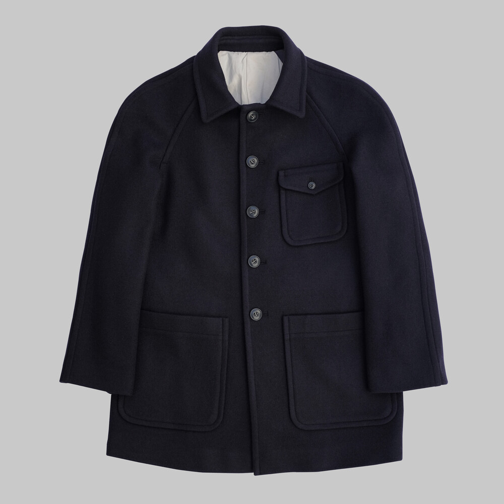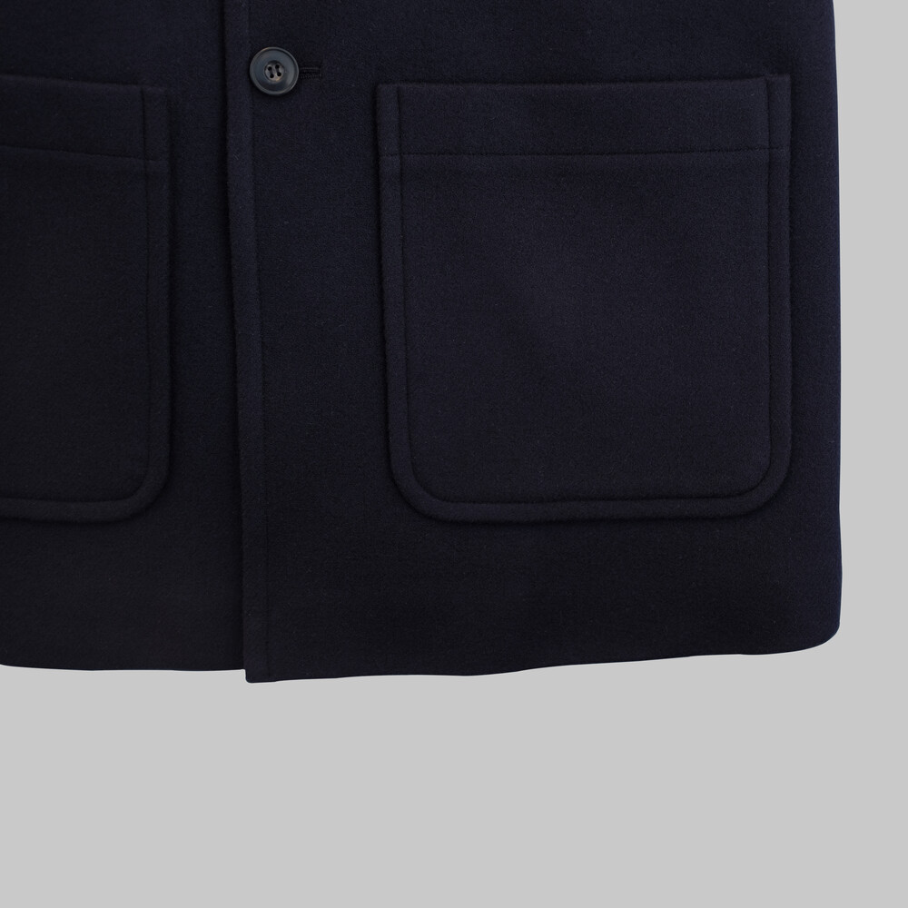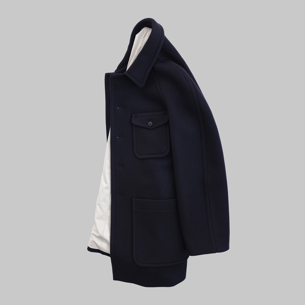 허벅지까지 오는 적당한 기장감과 군더더기 없이 깔끔한 디자인의 부드럽지만 단단한 멜톤 울 필드 코트입니다.