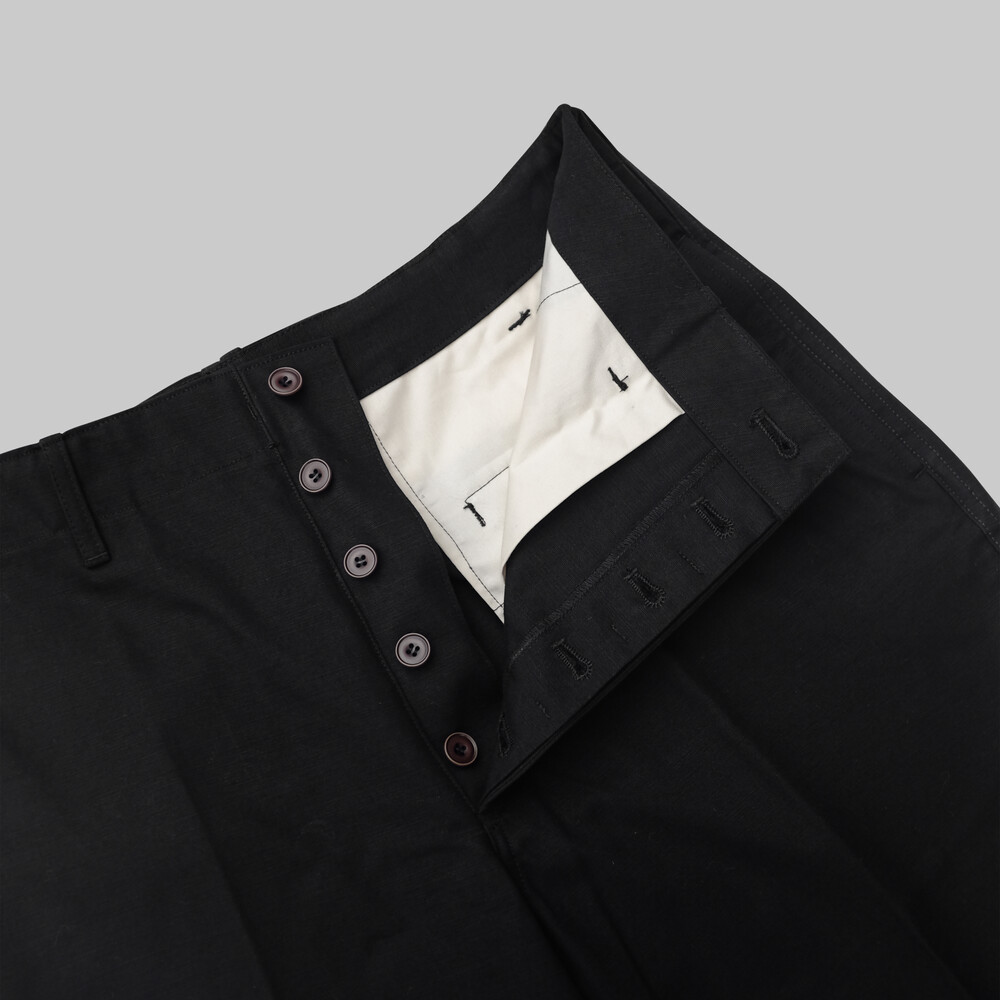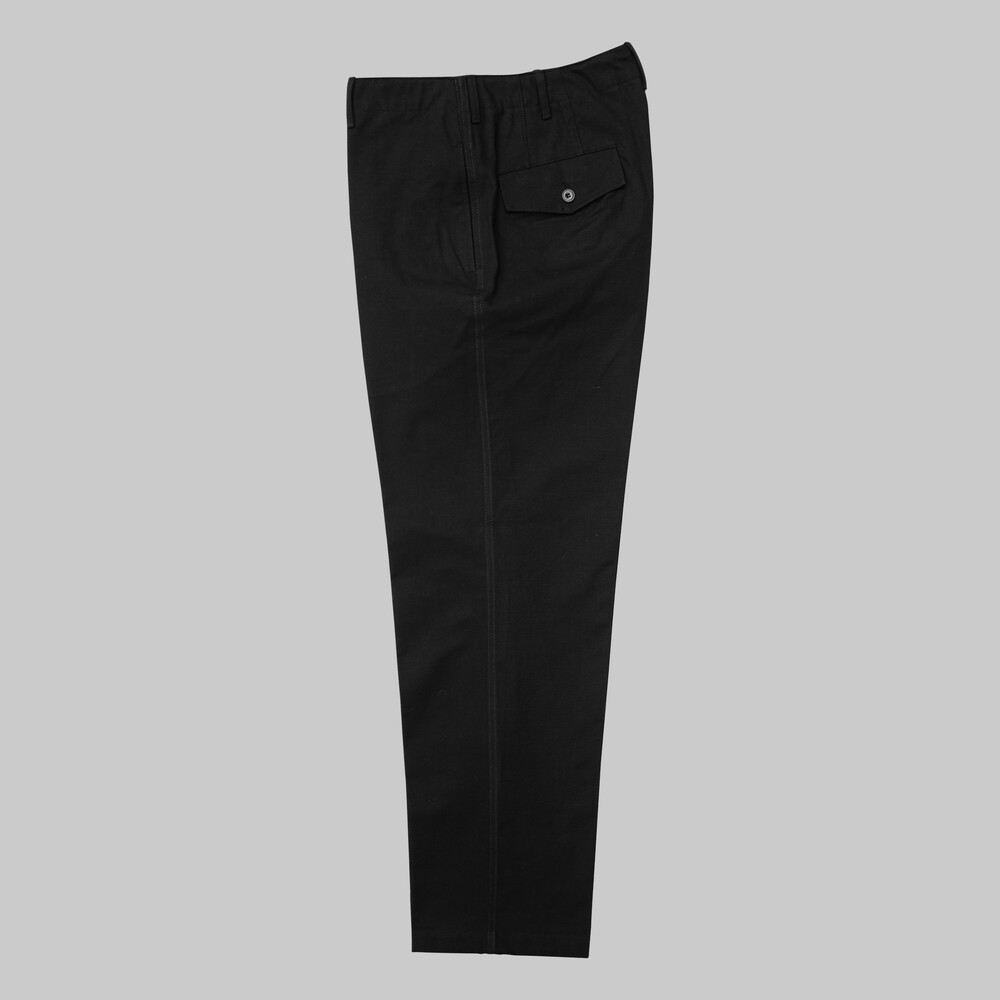 밑으로 갈수록 자연스럽게 좁아지는 테이퍼드 핏으로 너무 넓지 않게 적당히 여유 있는 실루엣의 형태를 지니고 있는 치노 팬츠입니다. 지퍼가 아닌 5버튼 플라이 구성으로 완성도를 더하였으며 넉넉한 힙 둘레는 편안한 착용감을 전해줍니다.