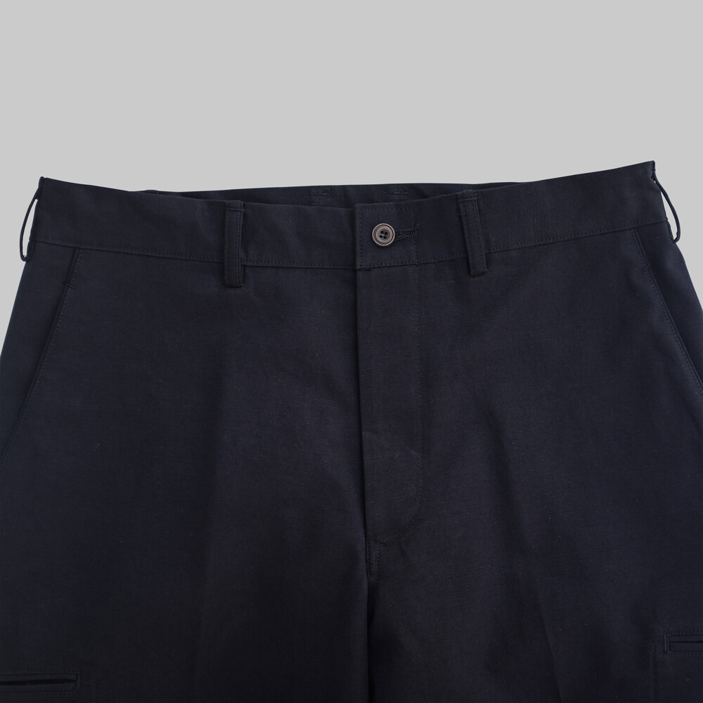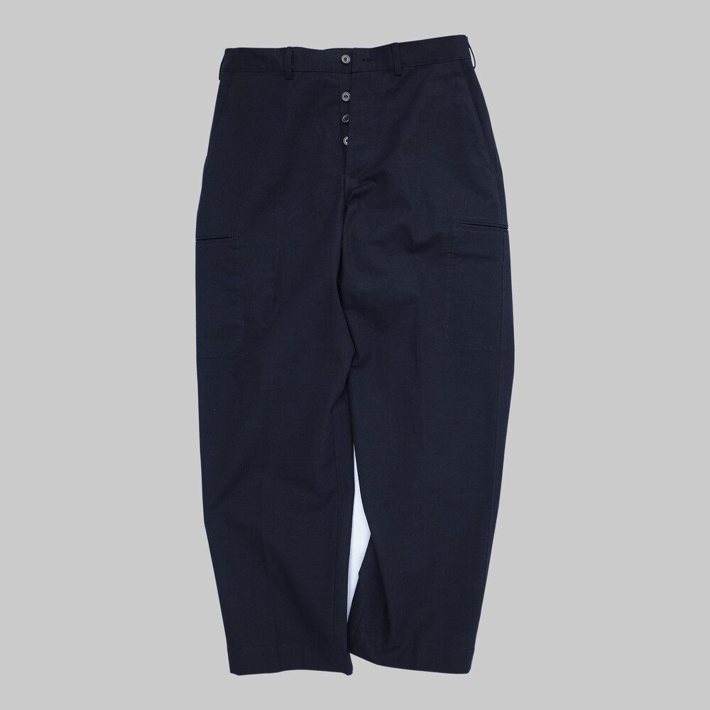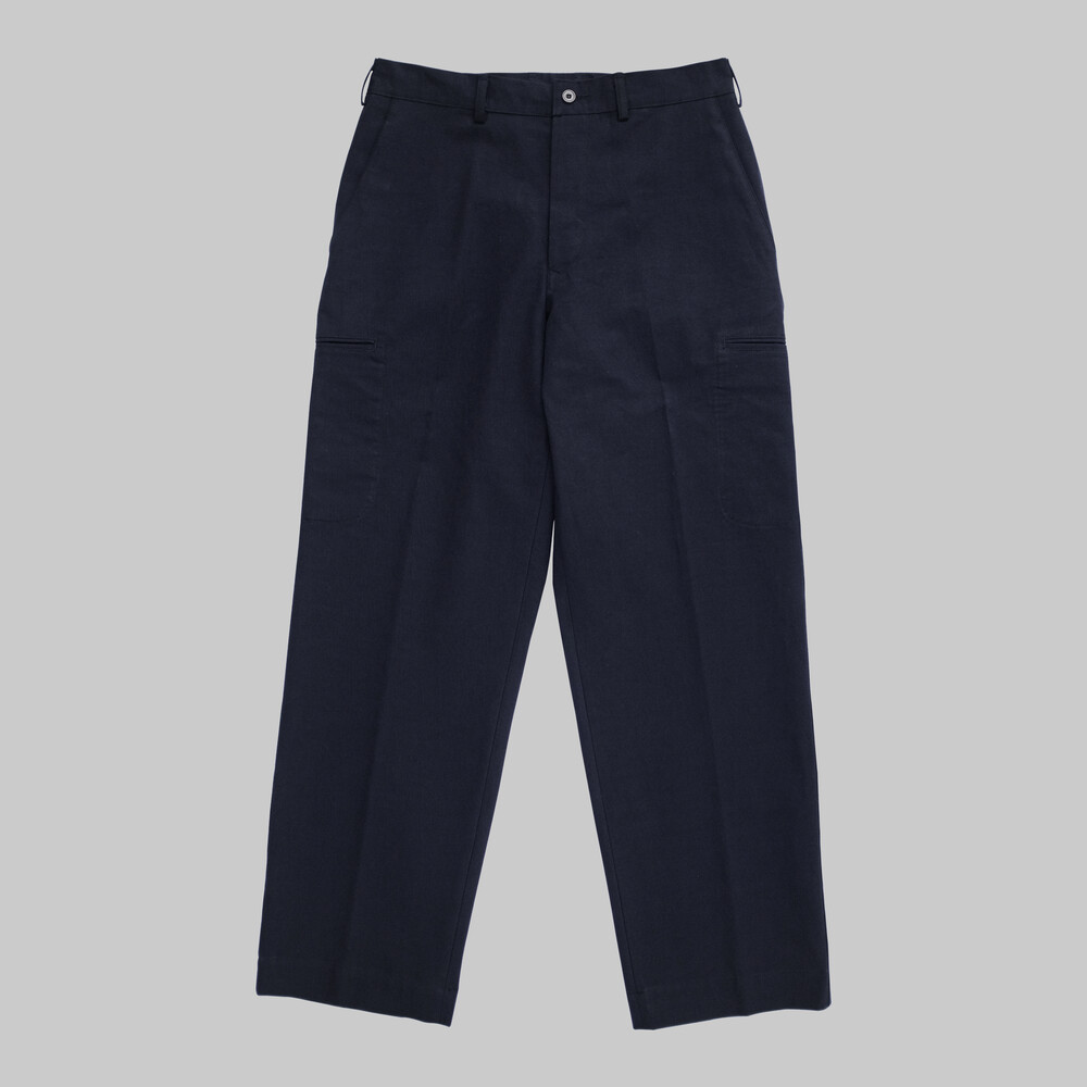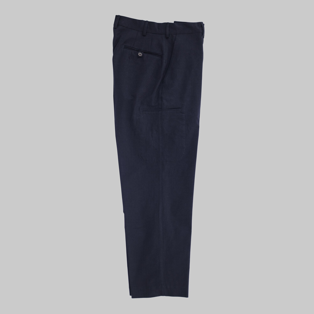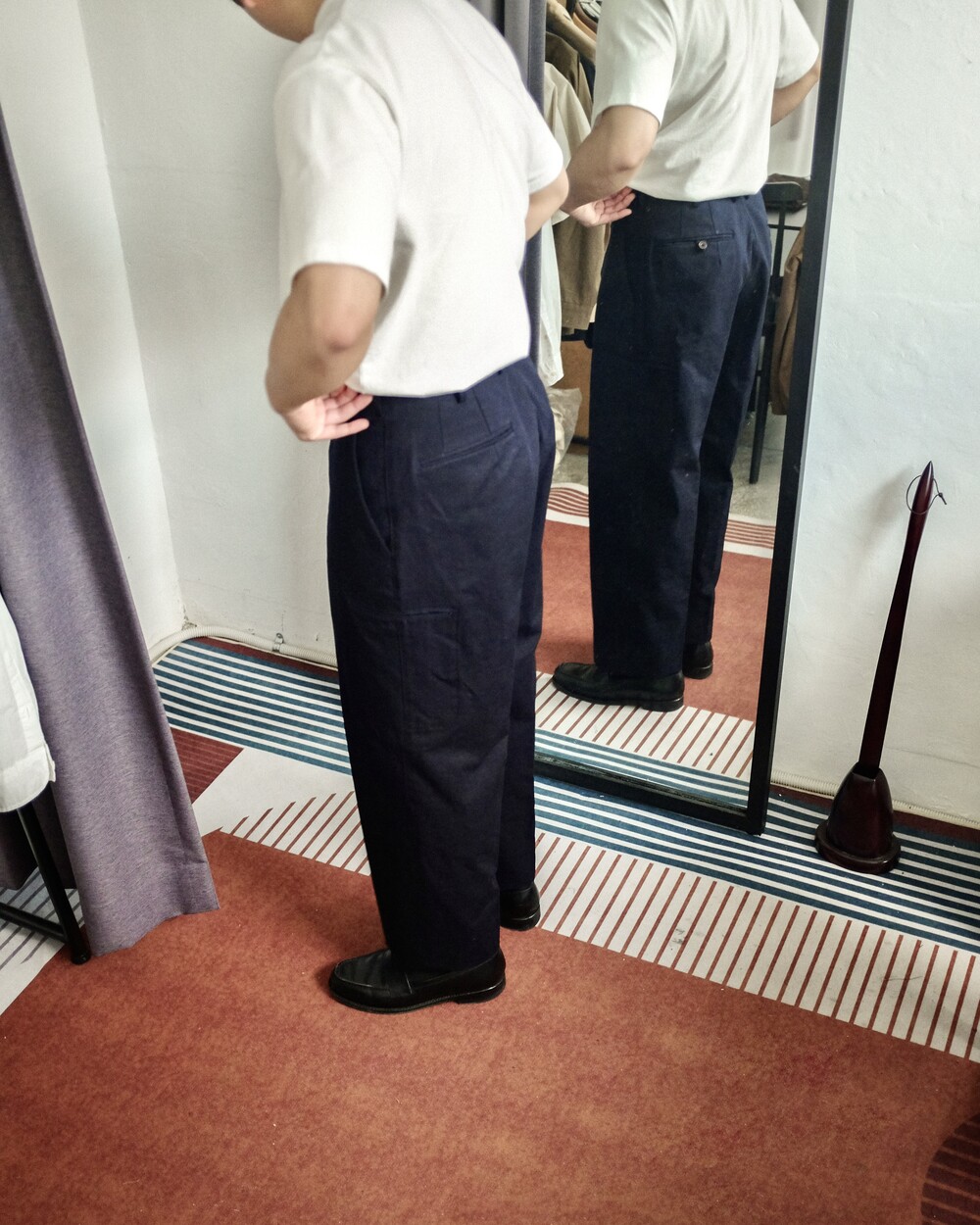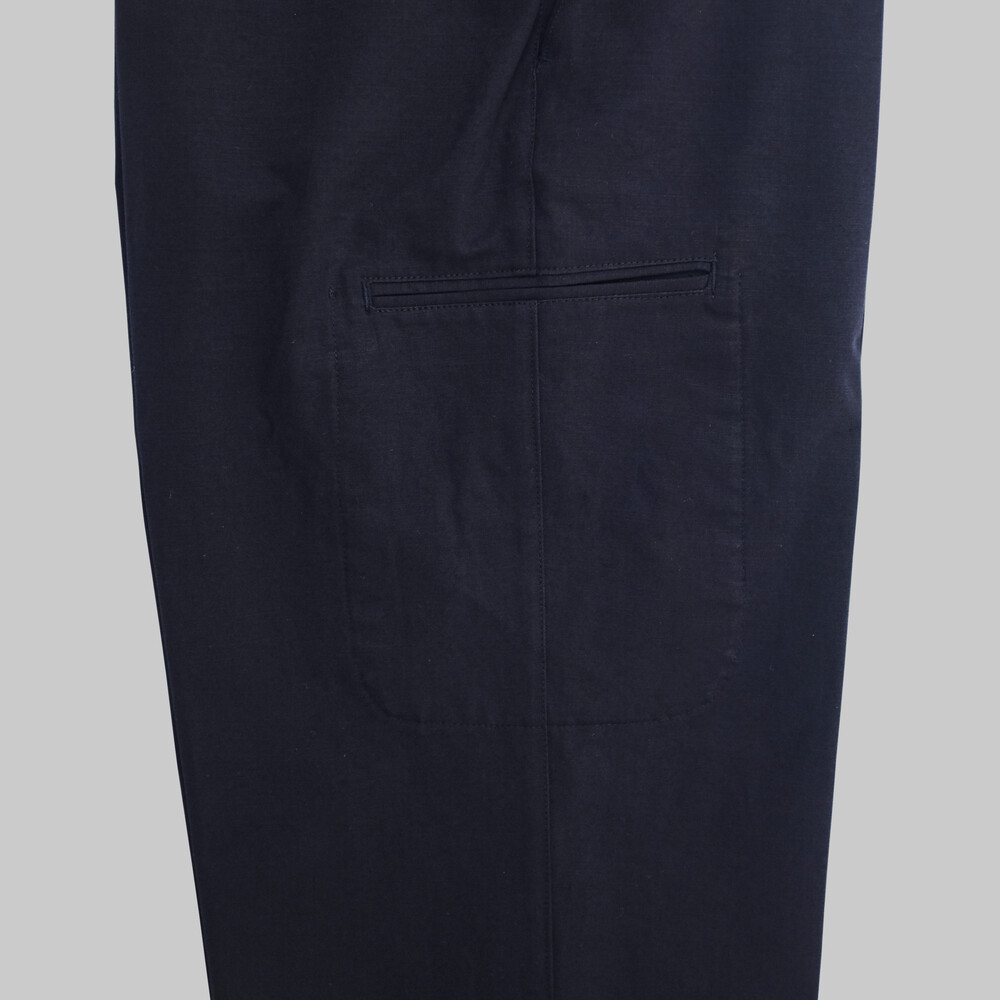 엉덩이부터 밑단으로 갈수록 자연스럽게 좁아지는 넉넉한 실루엣의 루즈 테이퍼드 핏으로 피팅 시 편안한 착용감을 느낄 수 있는 이번 팬츠는 지퍼가 아닌 5버튼 플라이 구성으로 완성도를 더하였고 덮개 없이 양쪽 사이드에 밋밋한 입술 포켓이 자리를 하여 얼핏 보면 카고 팬츠가 아닌 일반 치노처럼 보이는 게 특징입니다.