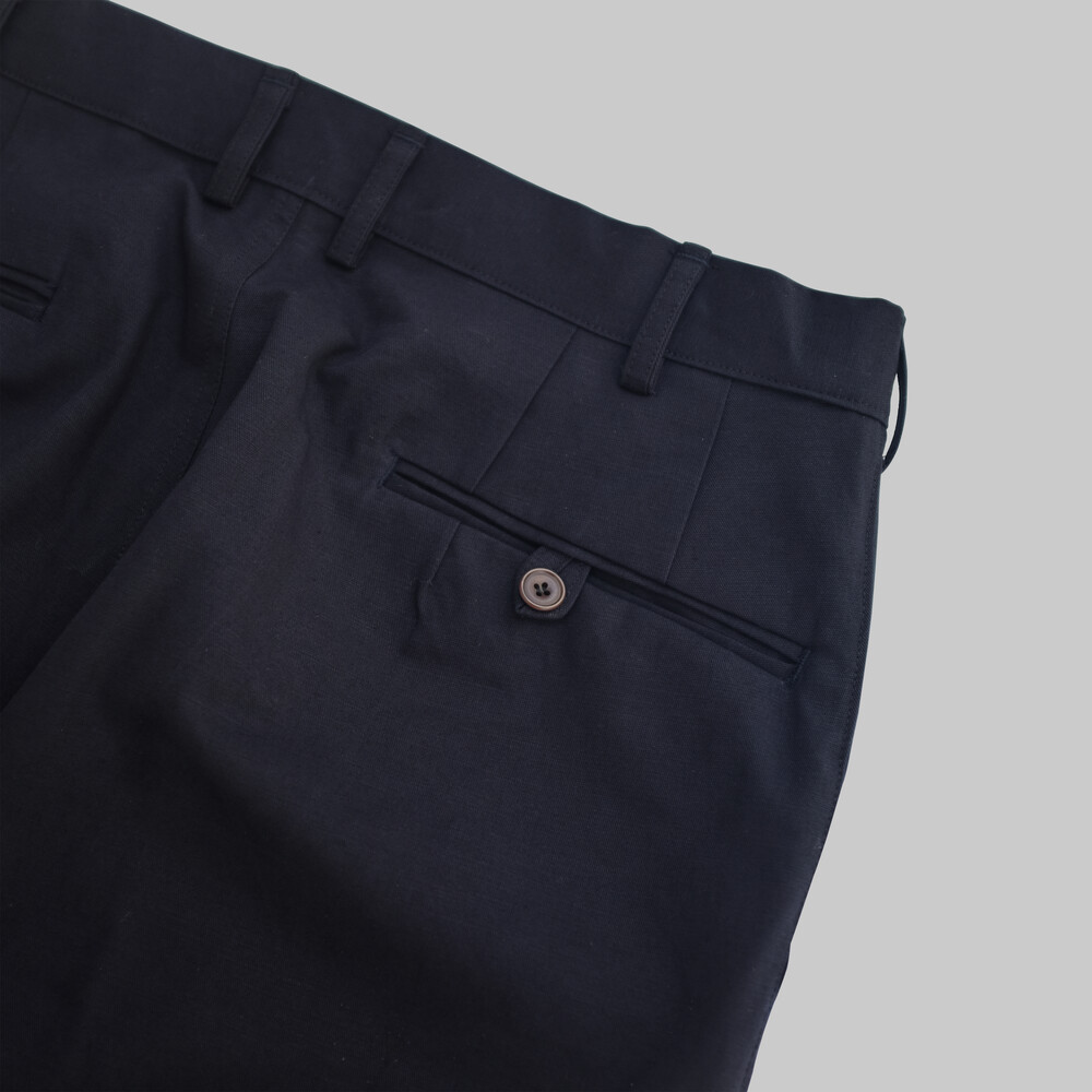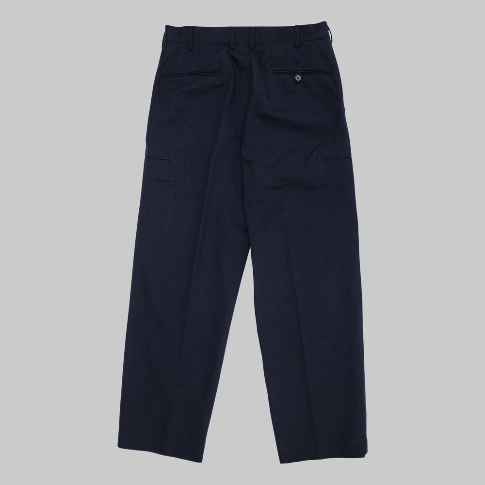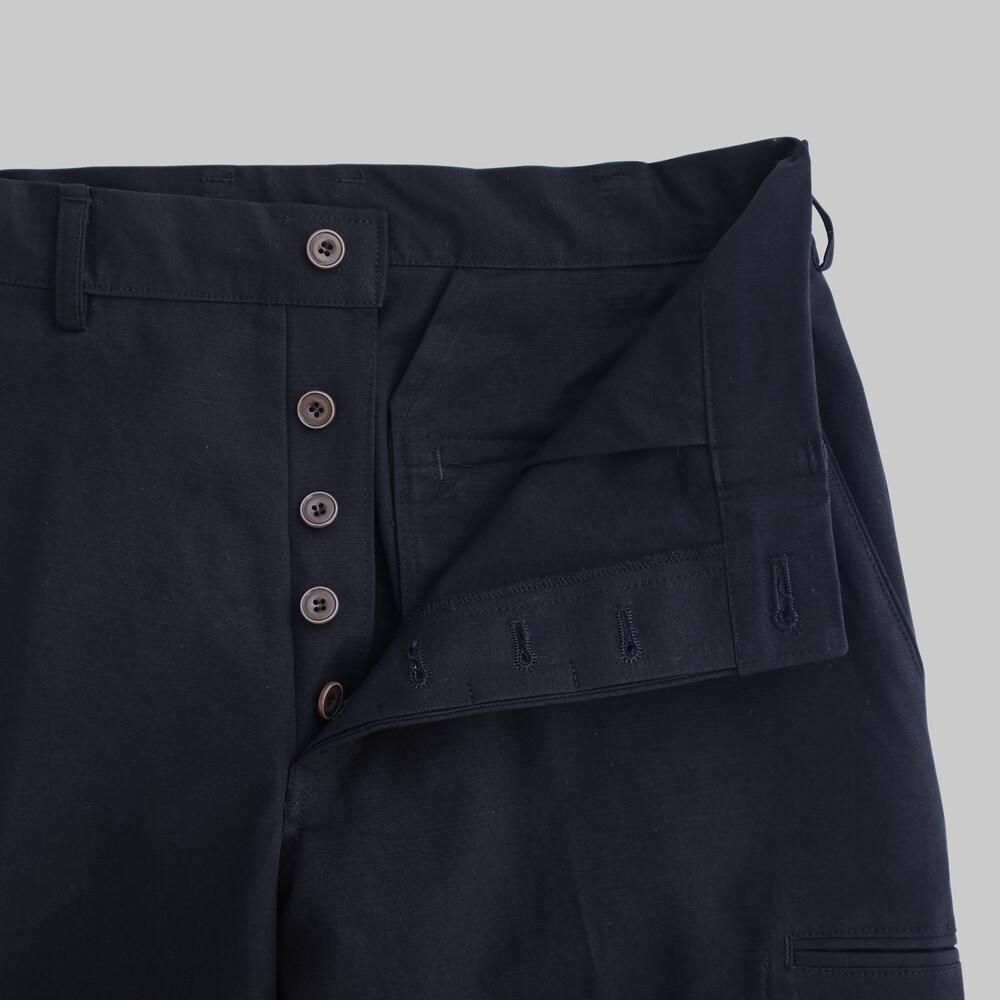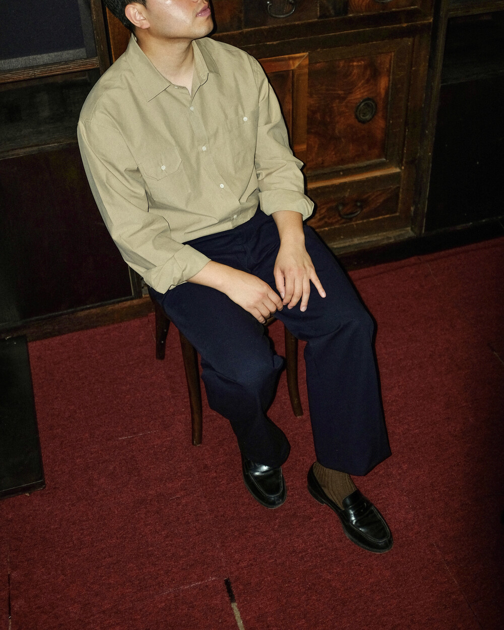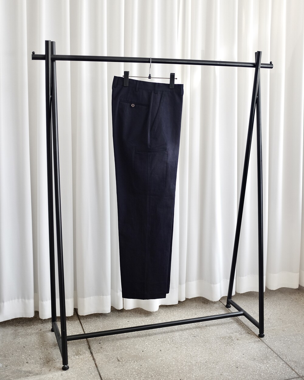 엉덩이부터 밑단으로 갈수록 자연스럽게 좁아지는 넉넉한 실루엣의 루즈 테이퍼드 핏으로 피팅 시 편안한 착용감을 느낄 수 있는 이번 팬츠는 지퍼가 아닌 5버튼 플라이 구성으로 완성도를 더하였고 덮개 없이 양쪽 사이드에 밋밋한 입술 포켓이 자리를 하여 얼핏 보면 카고 팬츠가 아닌 일반 치노처럼 보이는 게 특징입니다.