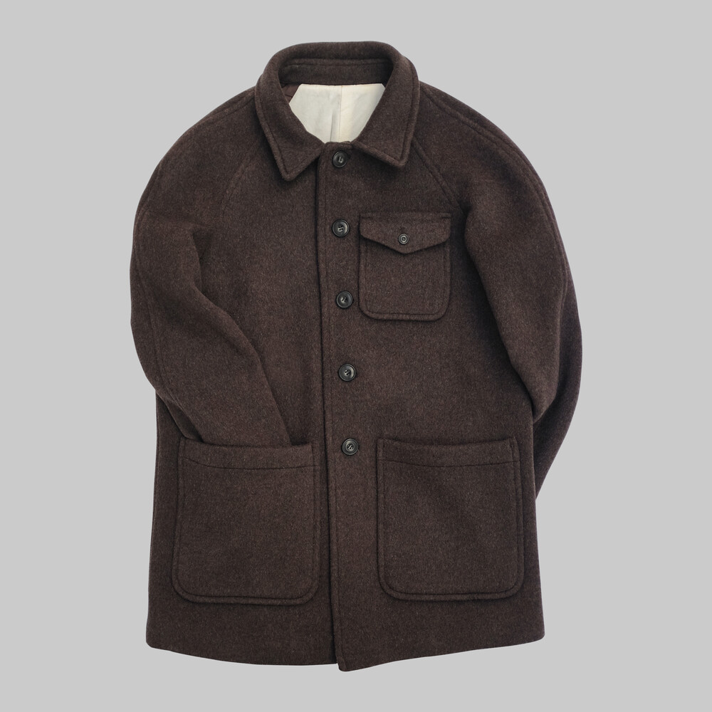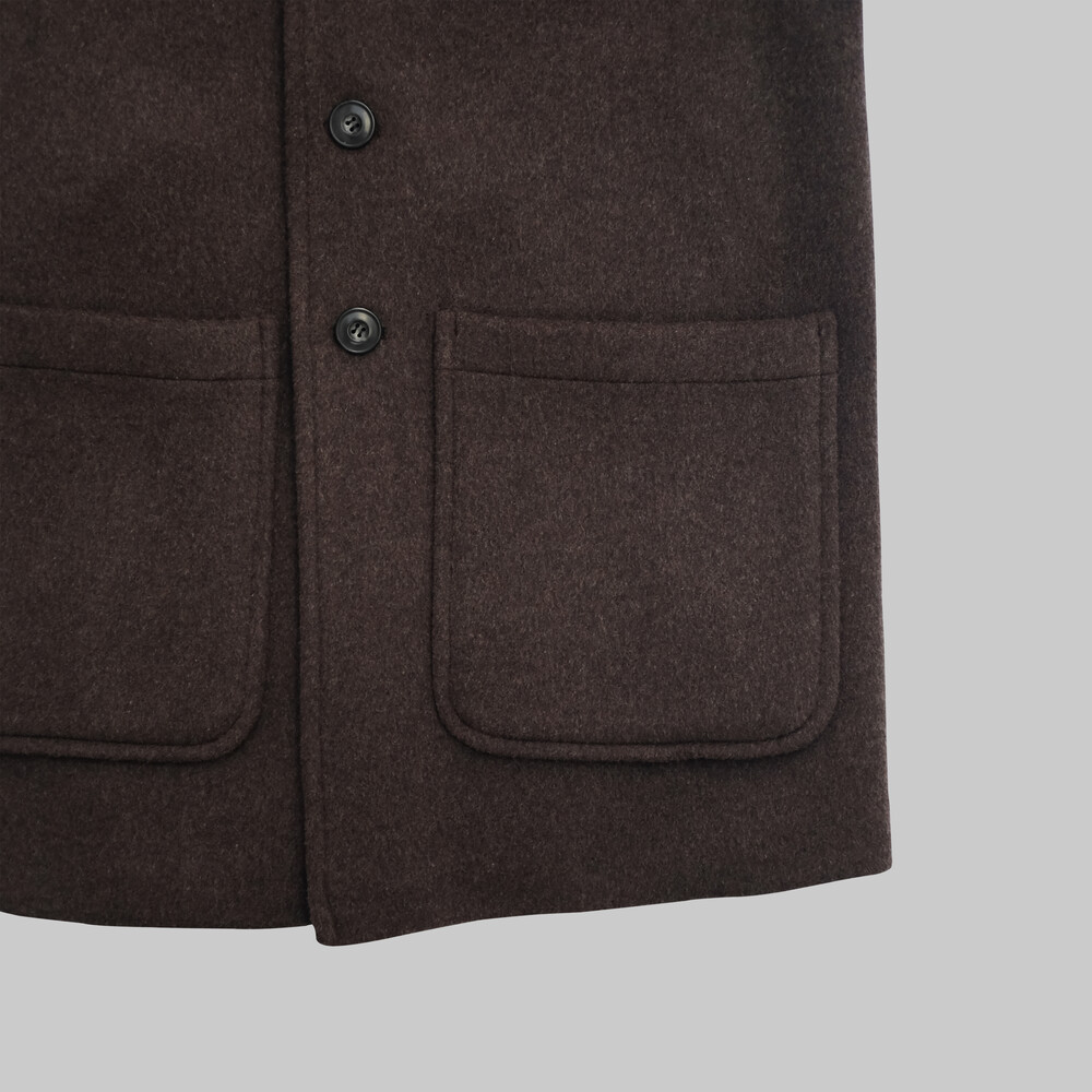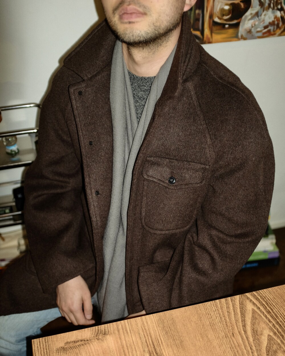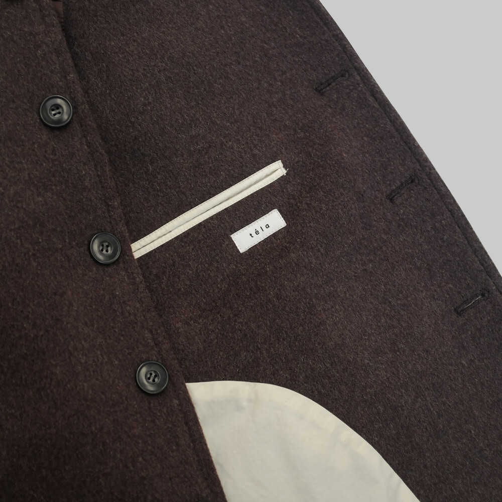 이중 빛이 도는 보카시 브라운 색상의 하프코트입니다. 부드럽지만 단단한 멜톤 울 소재가 적용되었으며 원단 자체에서 느껴지는 힘은 코트의 자연스러운 입체감을 더욱 돋보여줍니다.