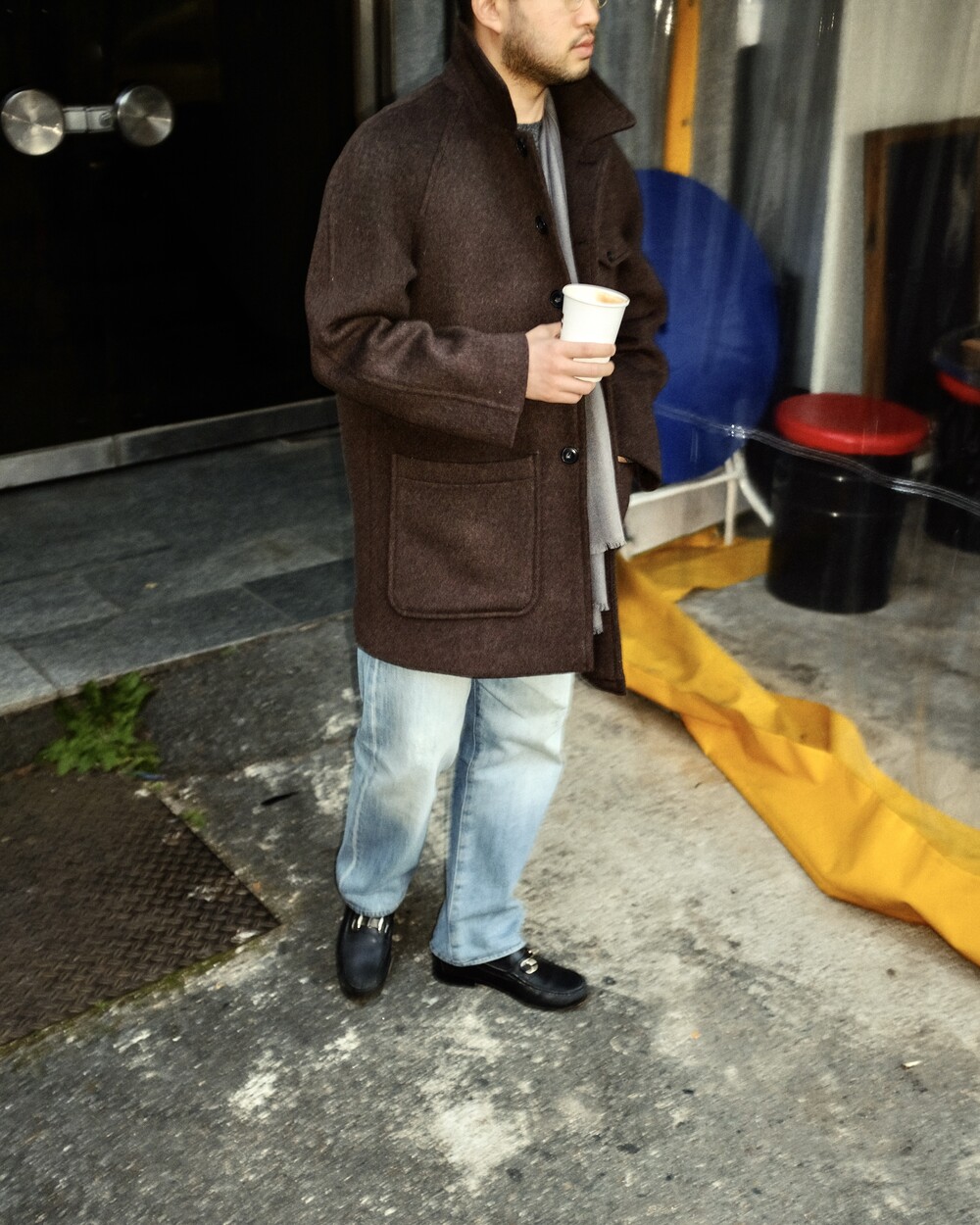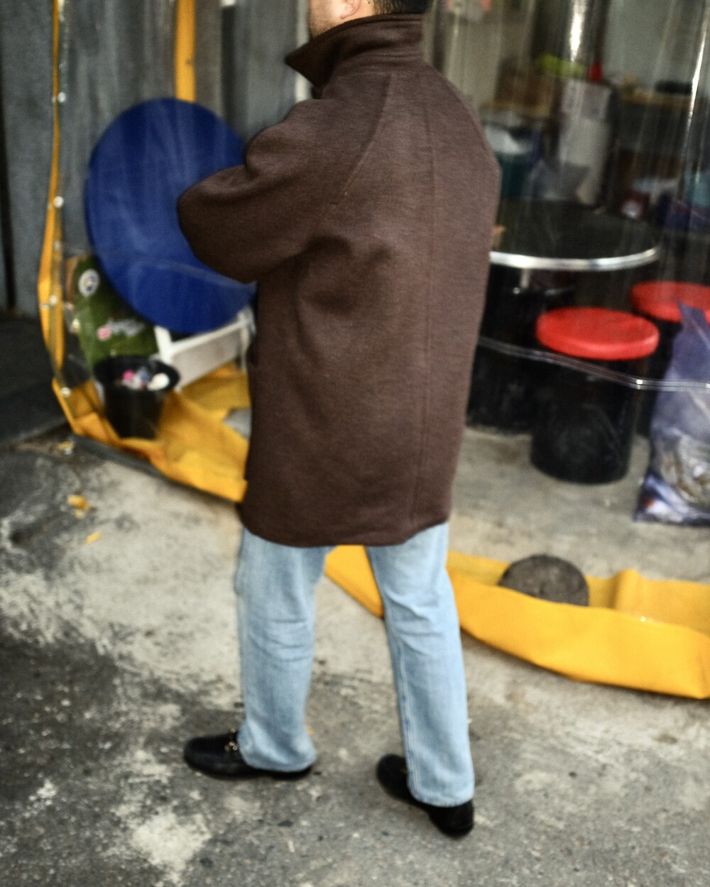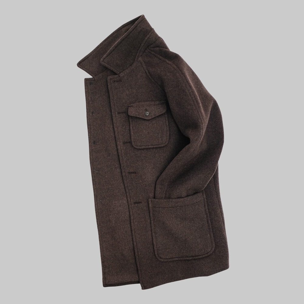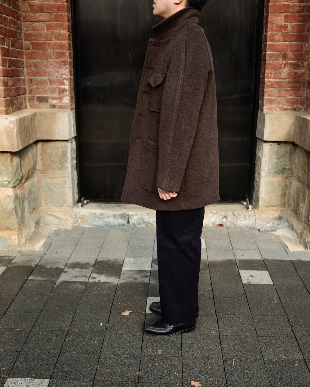 이중 빛이 도는 보카시 브라운 색상의 하프코트입니다. 부드럽지만 단단한 멜톤 울 소재가 적용되었으며 원단 자체에서 느껴지는 힘은 코트의 자연스러운 입체감을 더욱 돋보여줍니다.