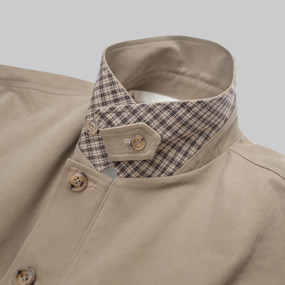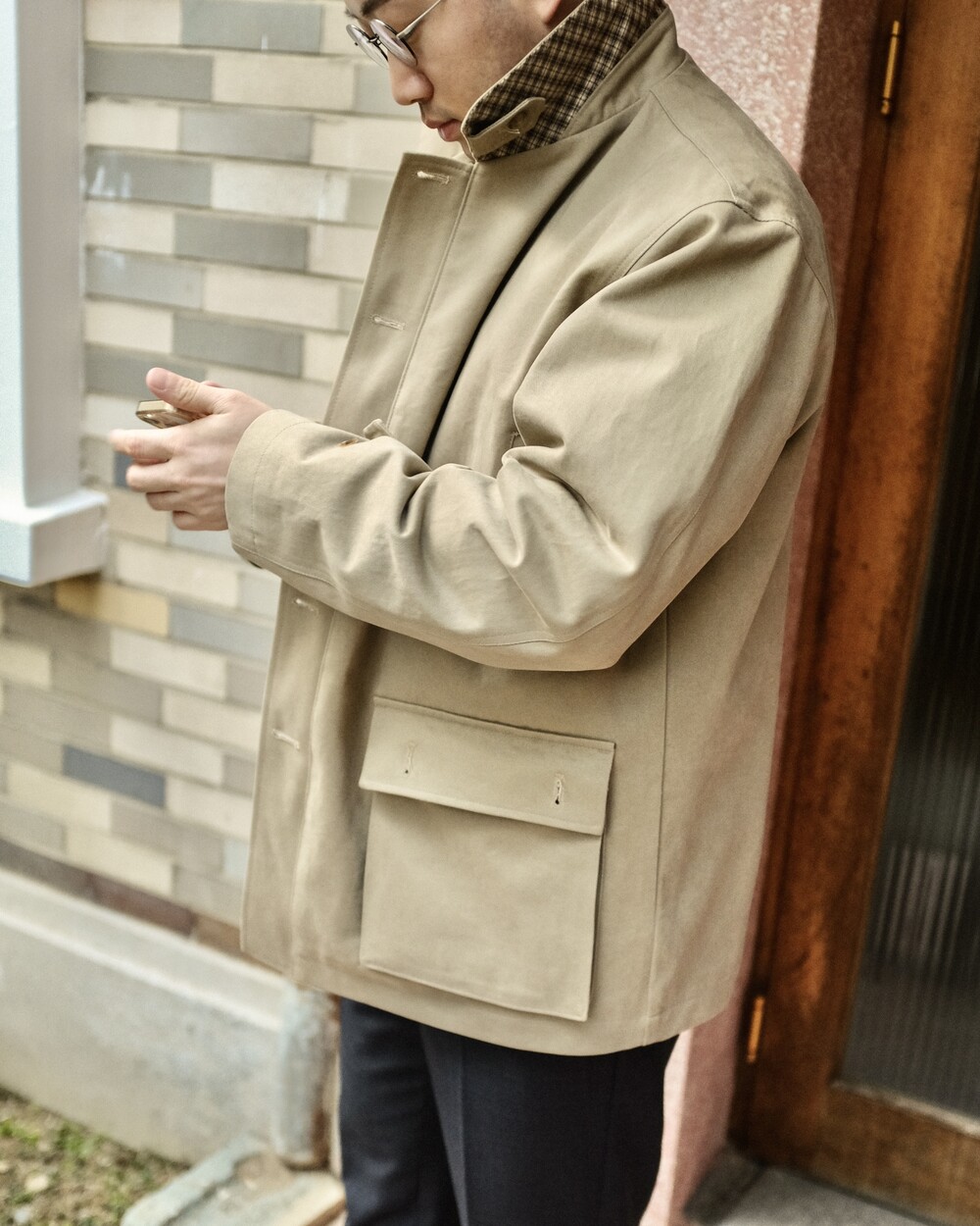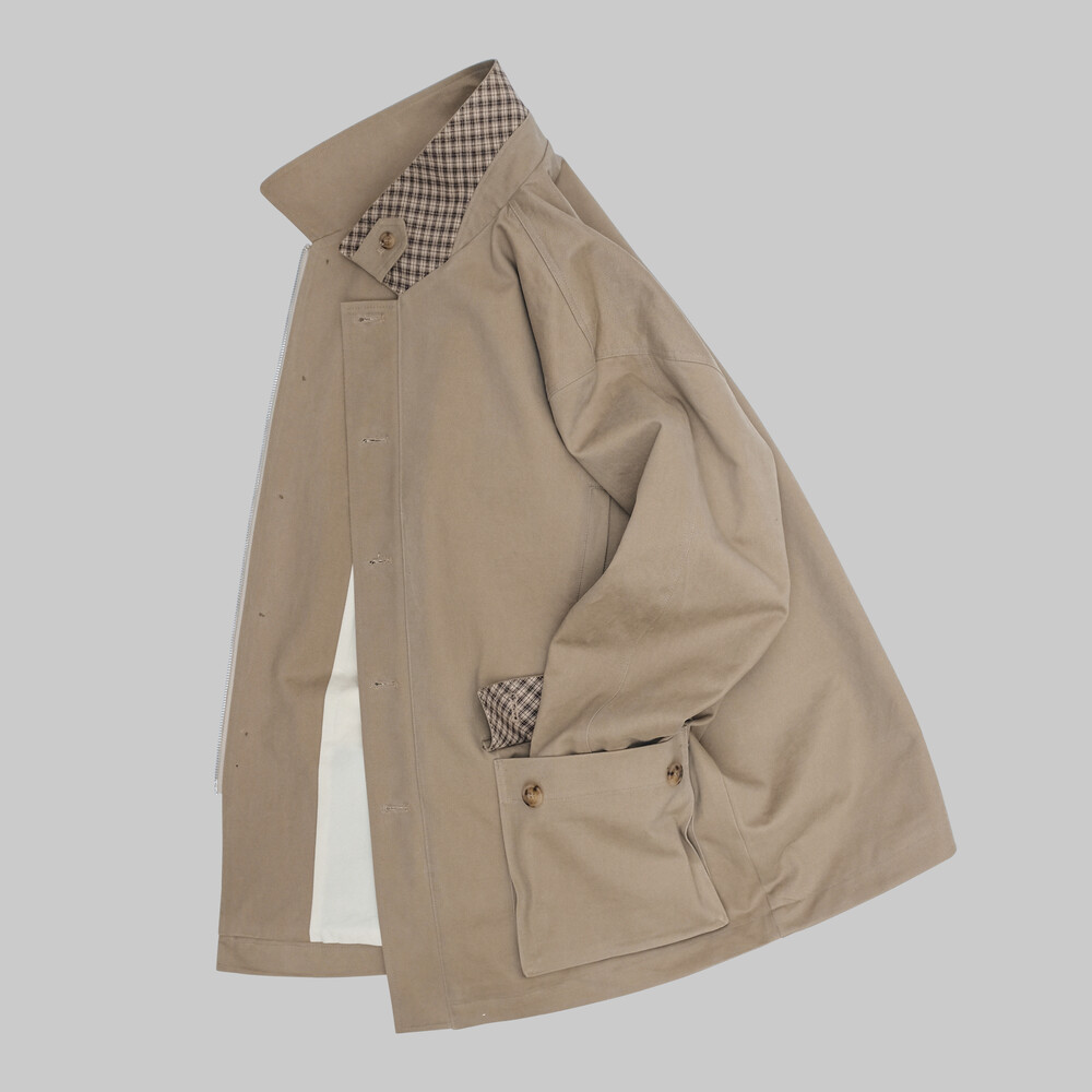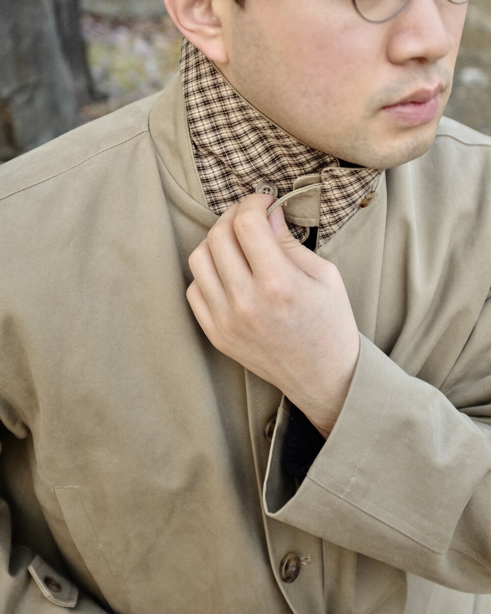 칼라 뒤쪽으로는 체크 패턴이 배색되어 칼라를 세웠을 때 또 다른 분위기의 연출이 가능하며 가장 베이직한 컬러감으로 누구나 부담 없이 입을 수 있는 높은 활용도를 가지고 있습니다.