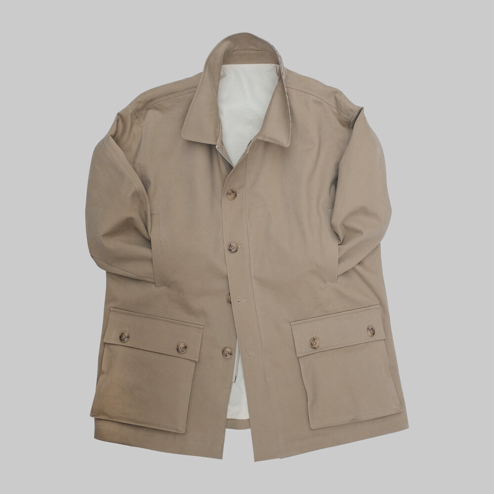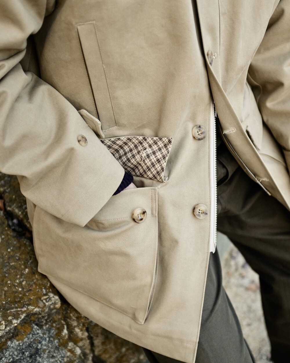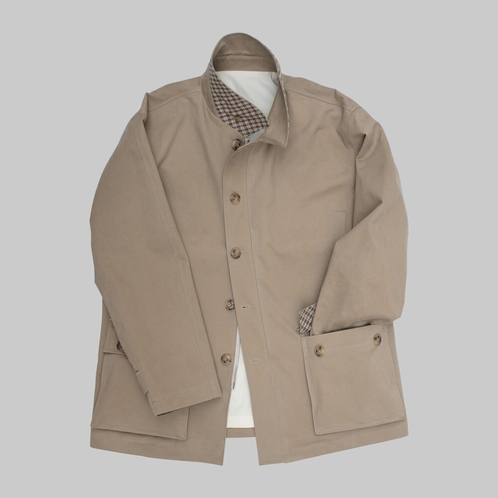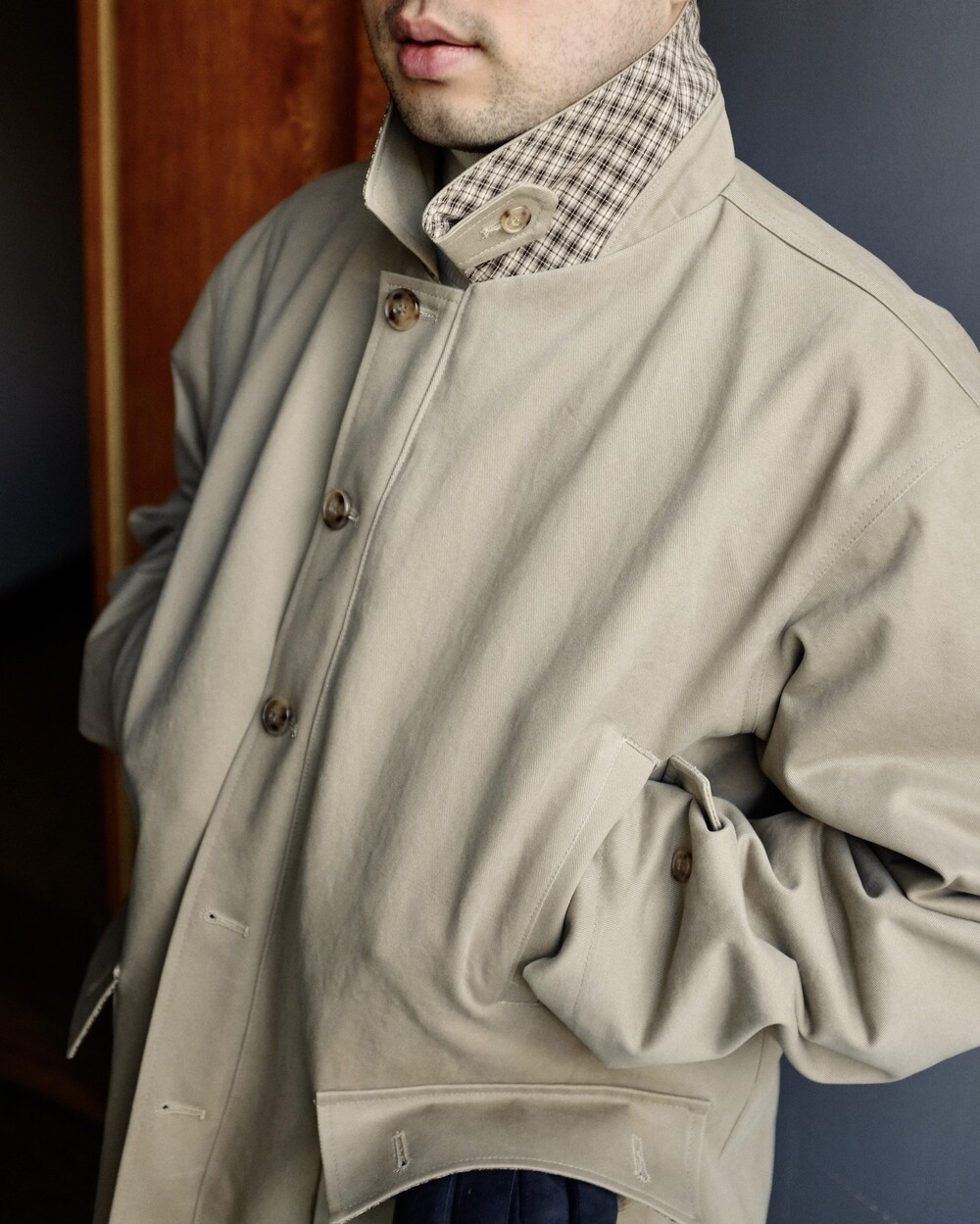 칼라 뒤쪽으로는 체크 패턴이 배색되어 칼라를 세웠을 때 또 다른 분위기의 연출이 가능하며 가장 베이직한 컬러감으로 누구나 부담 없이 입을 수 있는 높은 활용도를 가지고 있습니다.