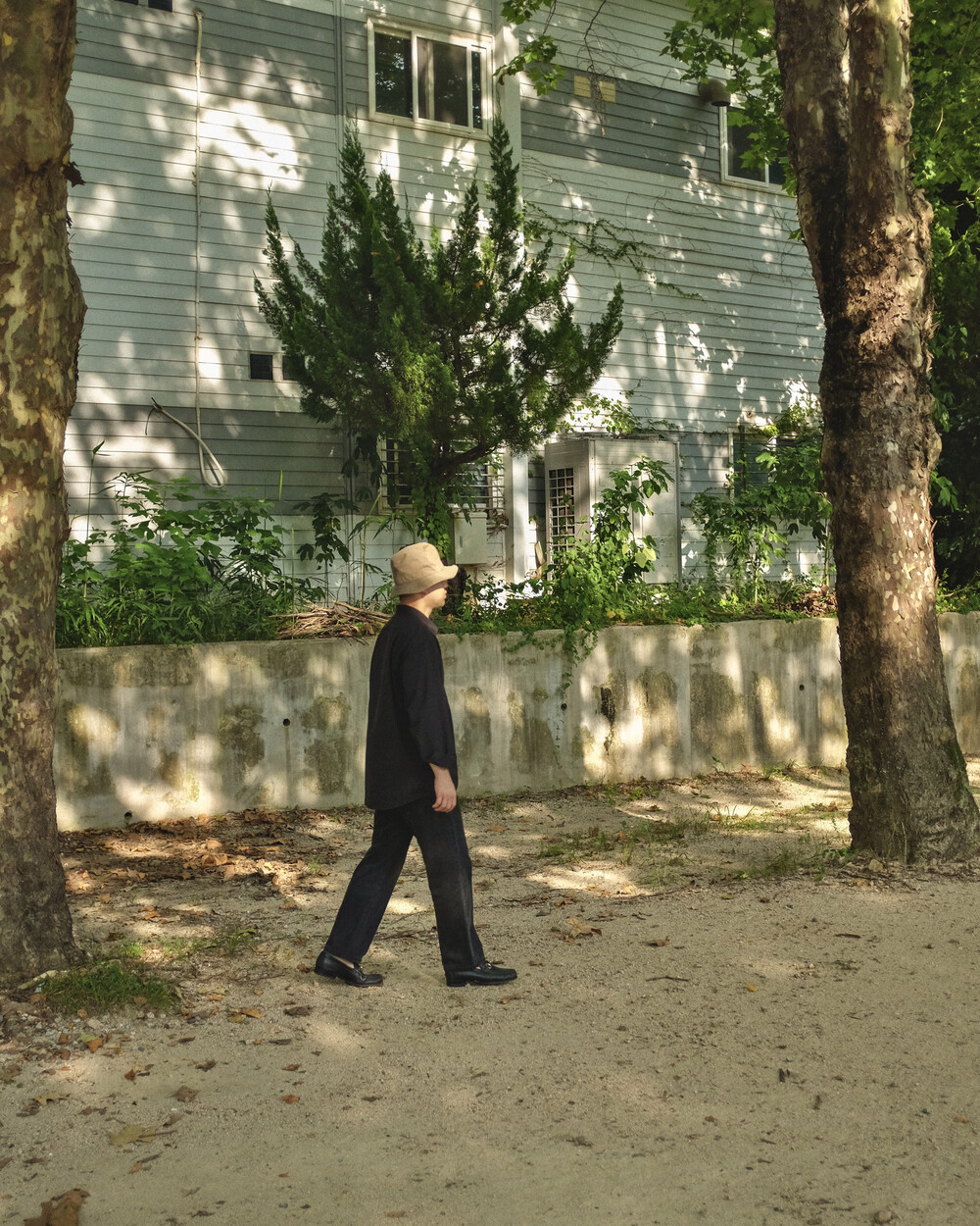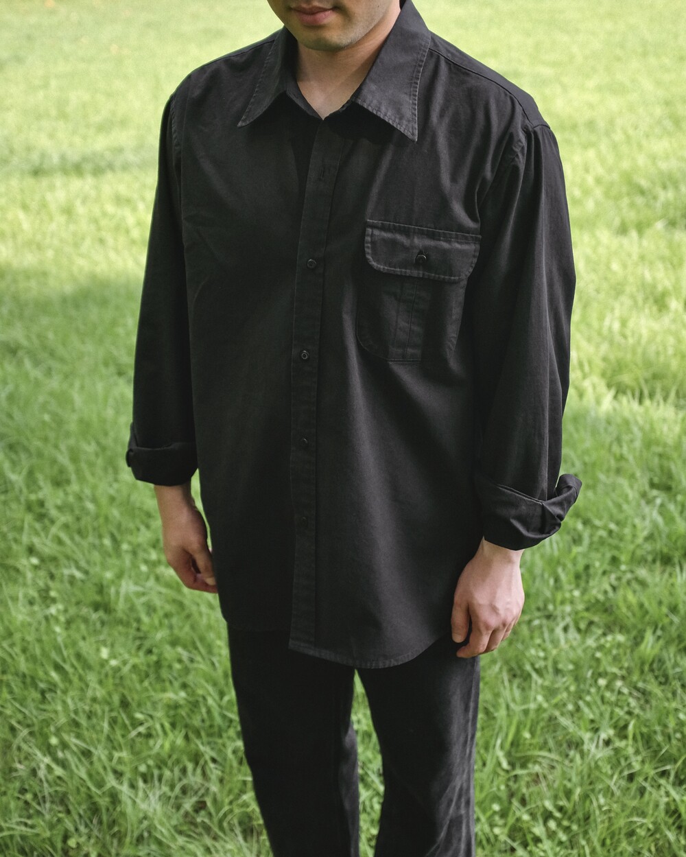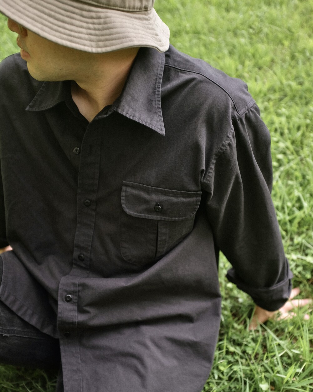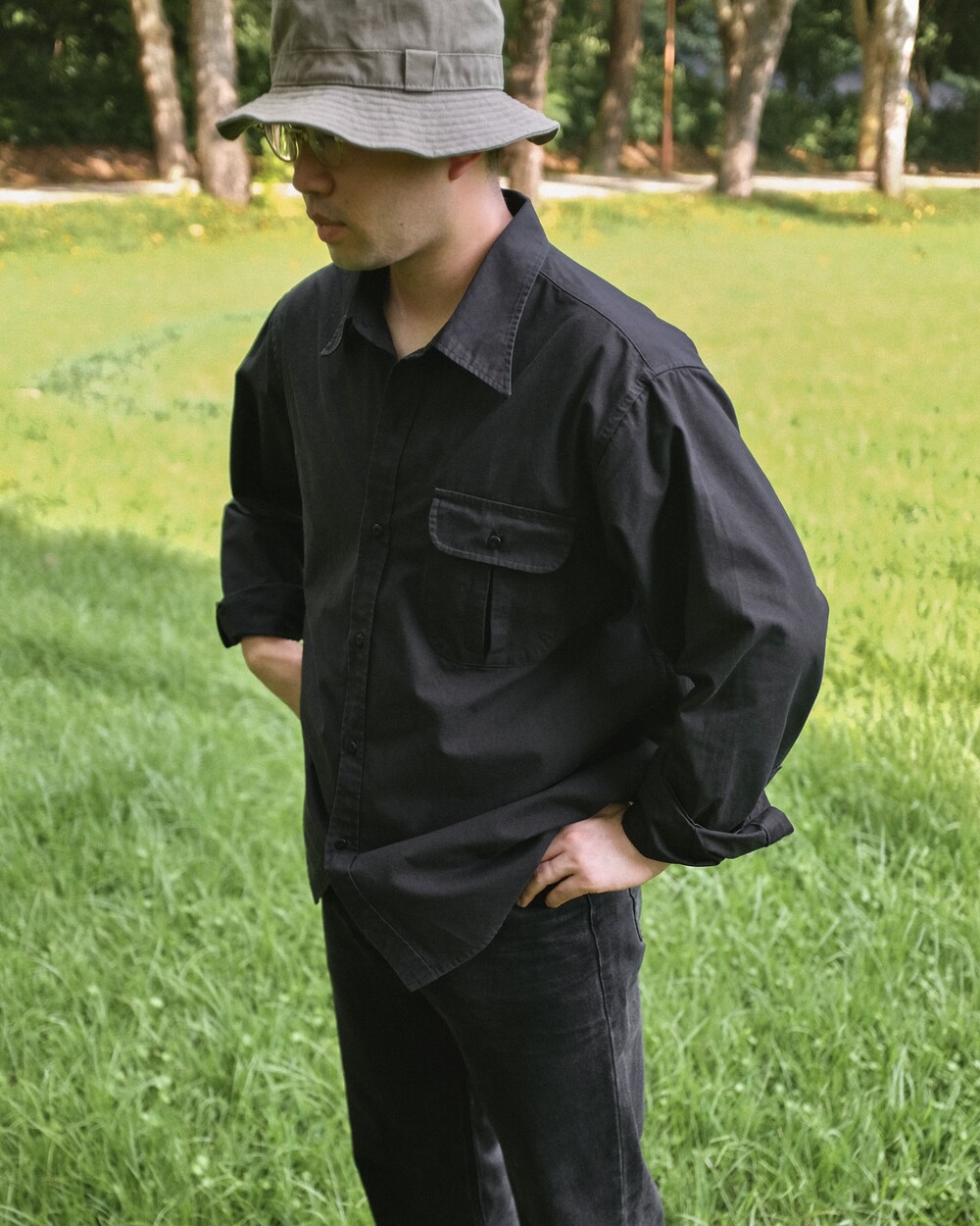두툼한 두께의 탄탄한 코튼 100% 원단을 사용하였으며 제작 후 가공을 통한 원단의 빈티지한 텍스처와 드라이한 터치감을 느끼실 수 있습니다.