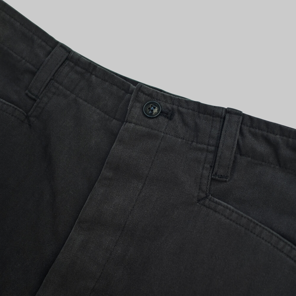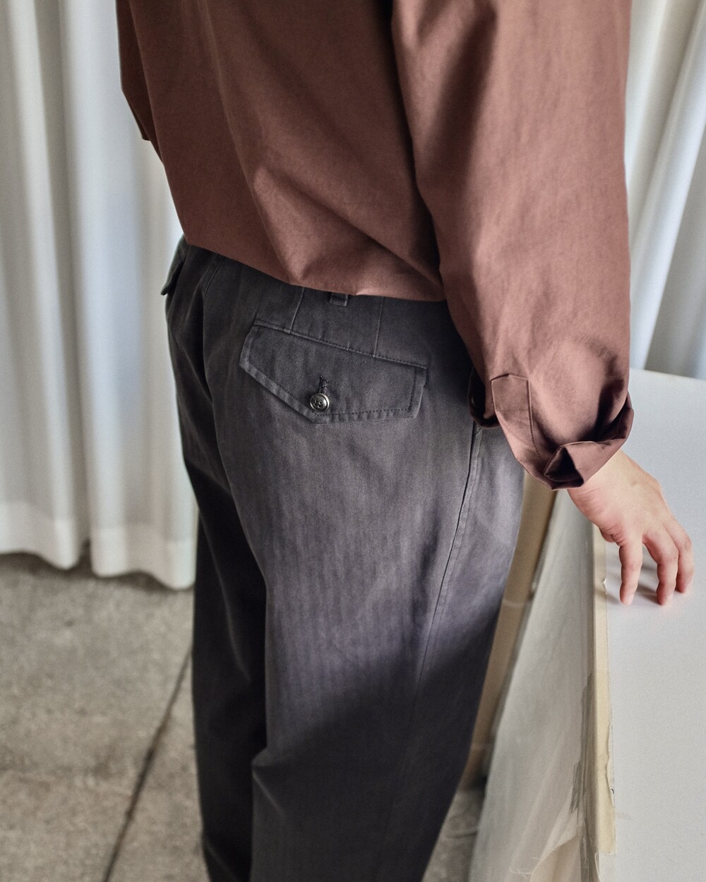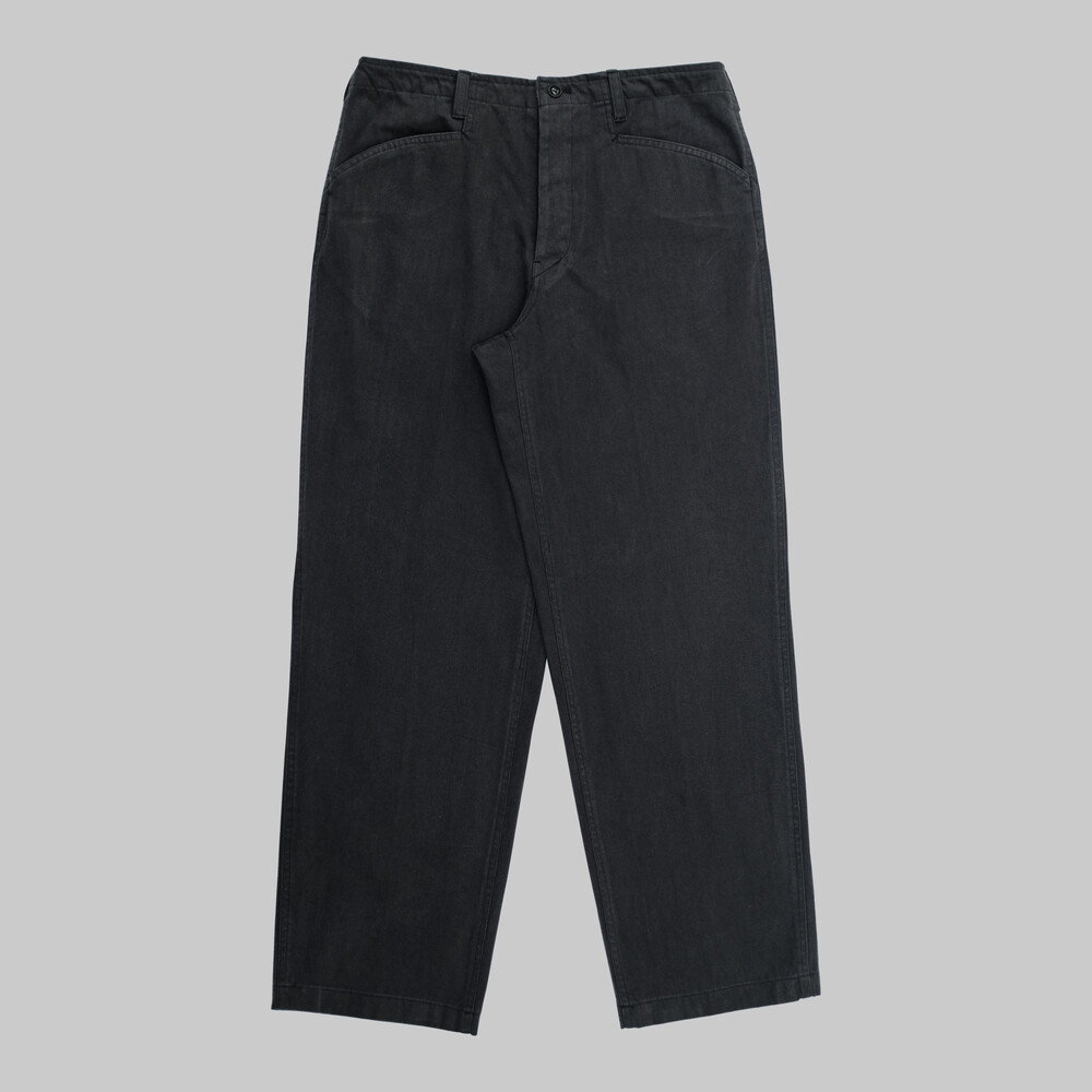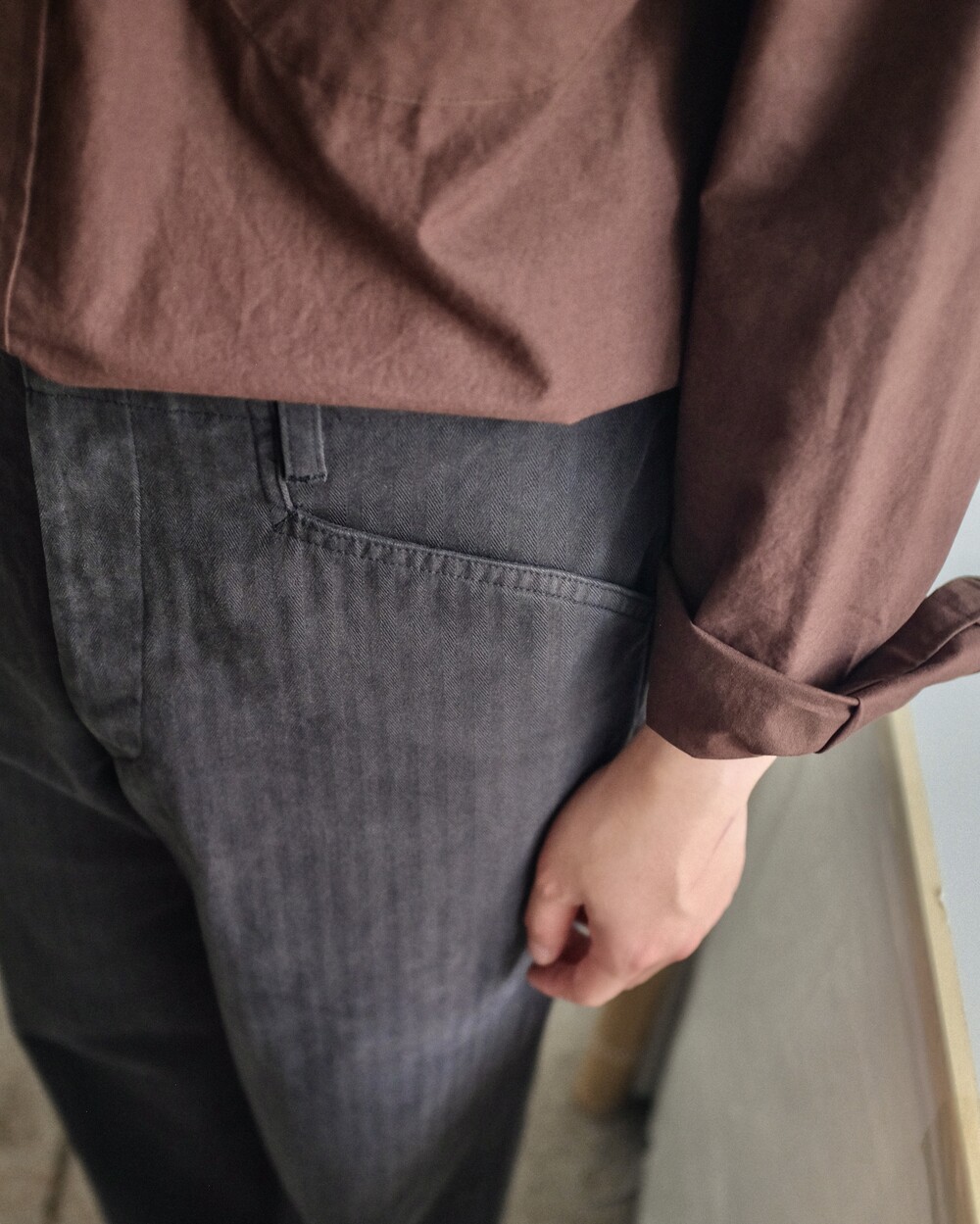 블랙에 가까운 오묘한 색감과 은은하게 드러나는 헤링본 텍스처가 매력적인 워크 팬츠입니다.