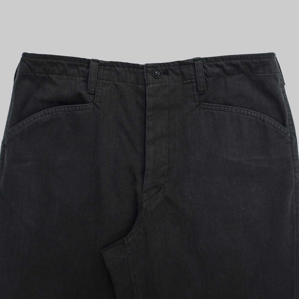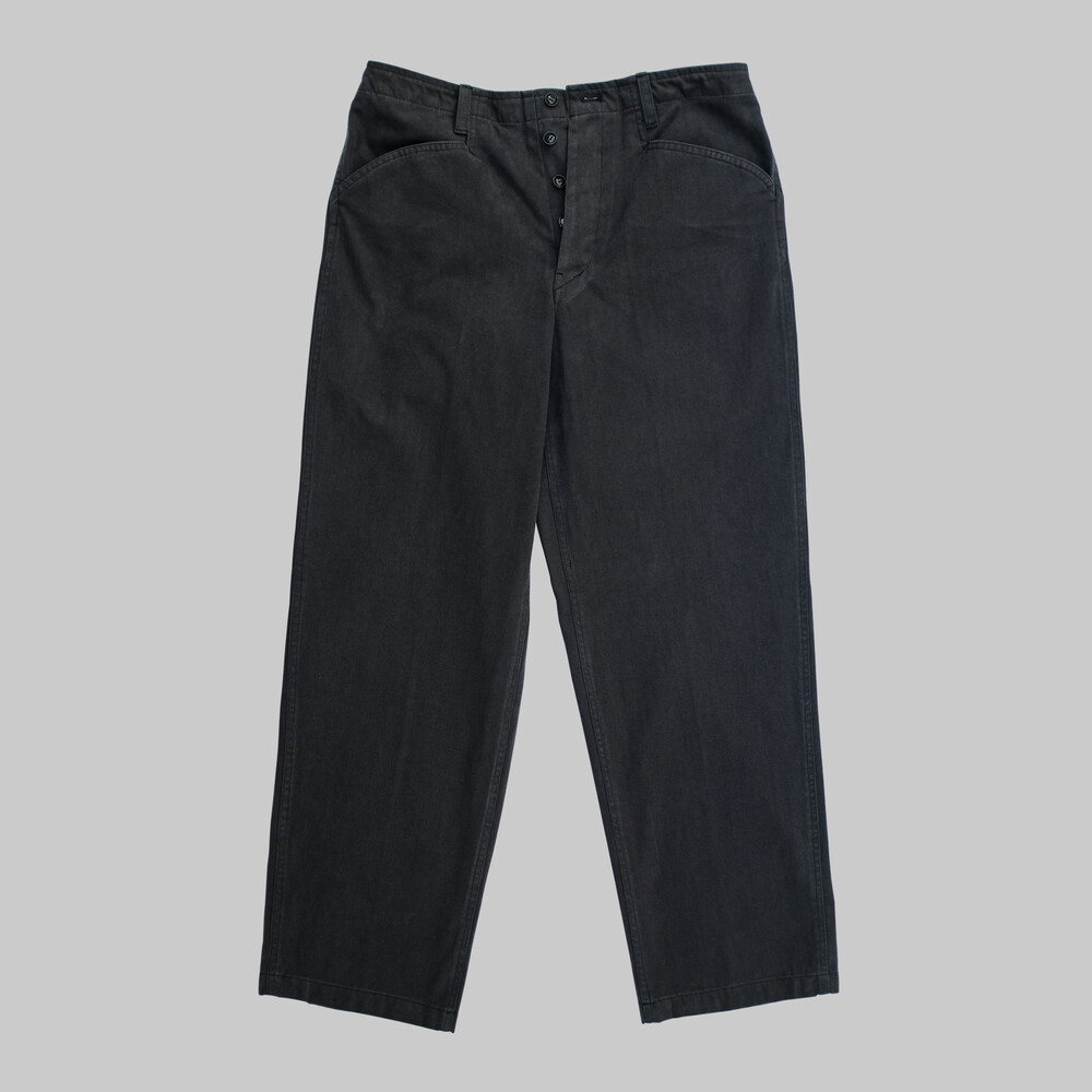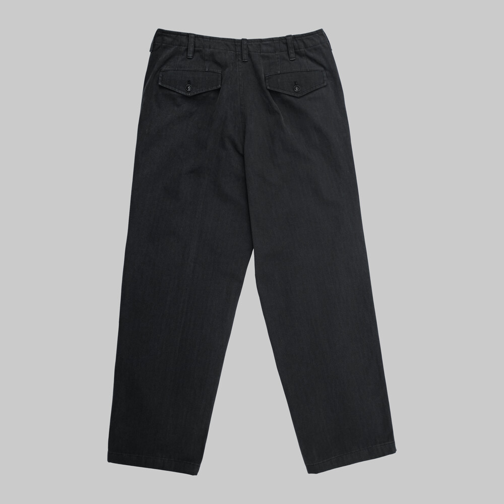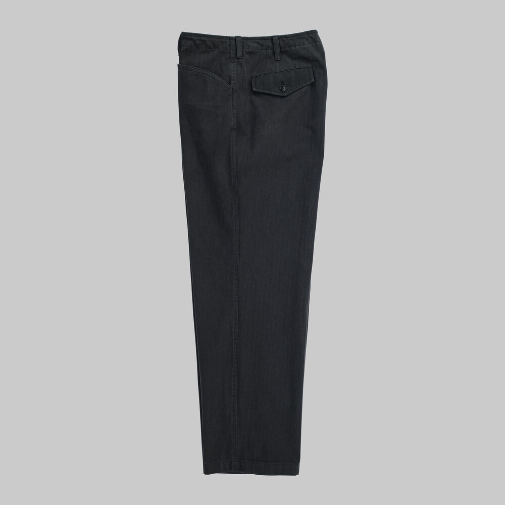 블랙에 가까운 오묘한 색감과 은은하게 드러나는 헤링본 텍스처가 매력적인 워크 팬츠입니다.
