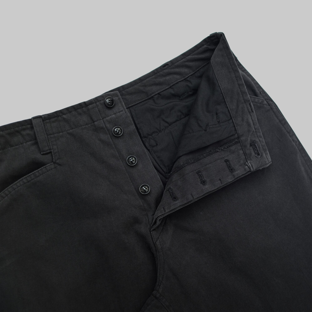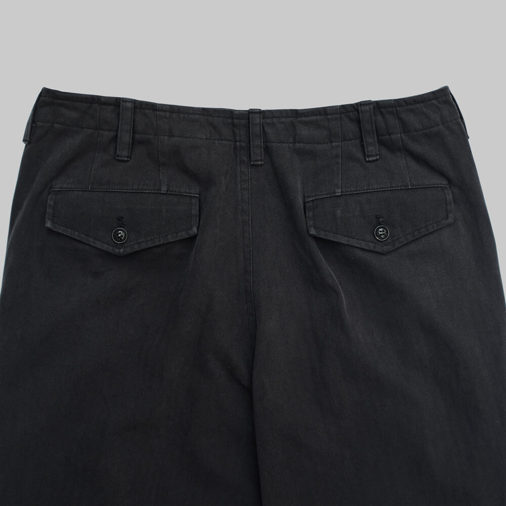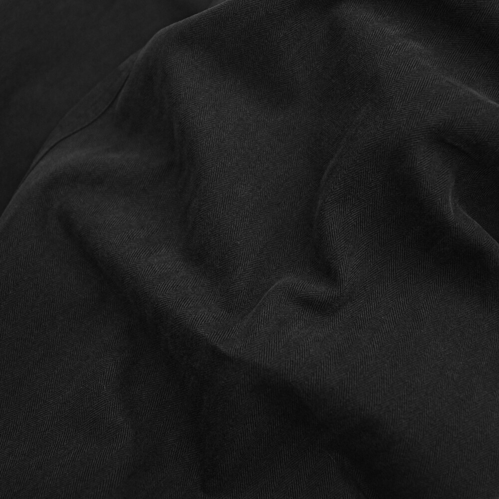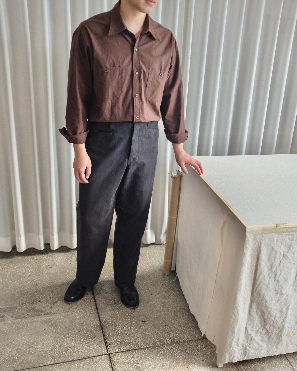 블랙에 가까운 오묘한 색감과 은은하게 드러나는 헤링본 텍스처가 매력적인 워크 팬츠입니다.