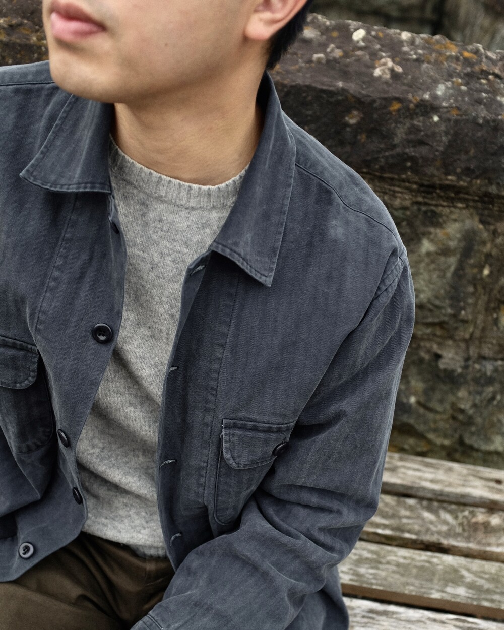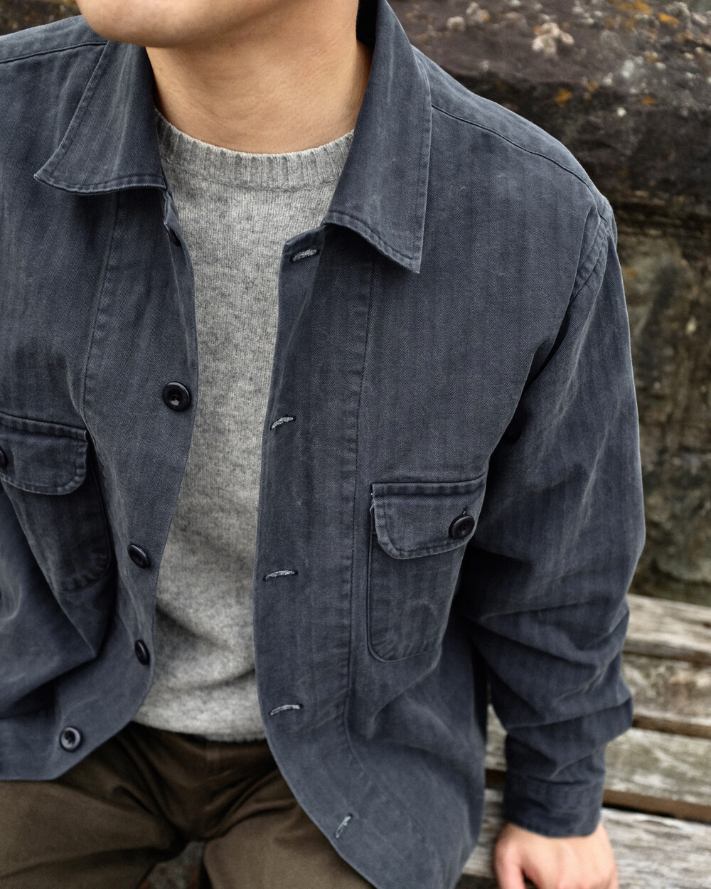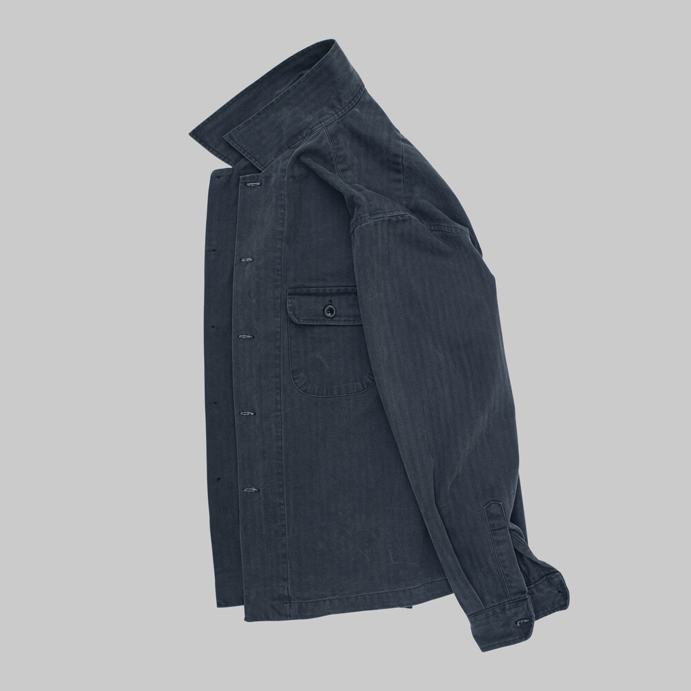 고밀도의 헤링본 트윌 코튼 소재가 적용되었으며 제작 후 가공을 통한 자연스러운 페이딩과 퍼커링 등 빈티지함이 매력적인 유틸리티 셔츠입니다.