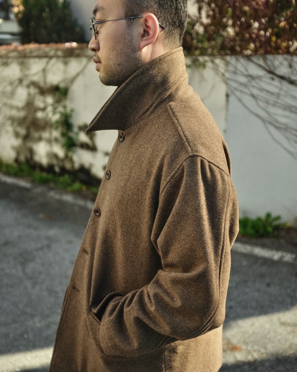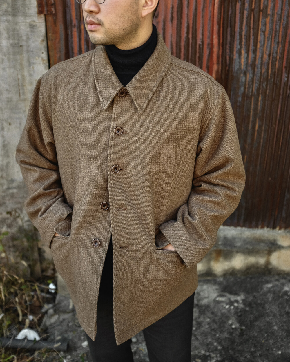 전면 하단에 두 개의 플랩포켓과 다소 좁은 단추 간격 그리고 우아한 칼라의 형태는 과거 워크웨어 본연의 디테일을 유지하였습니다.