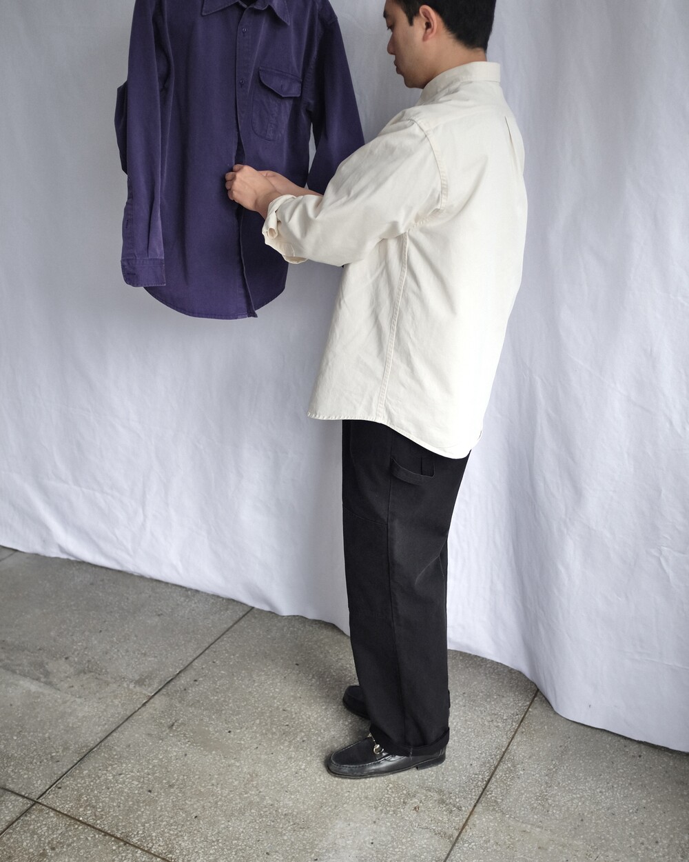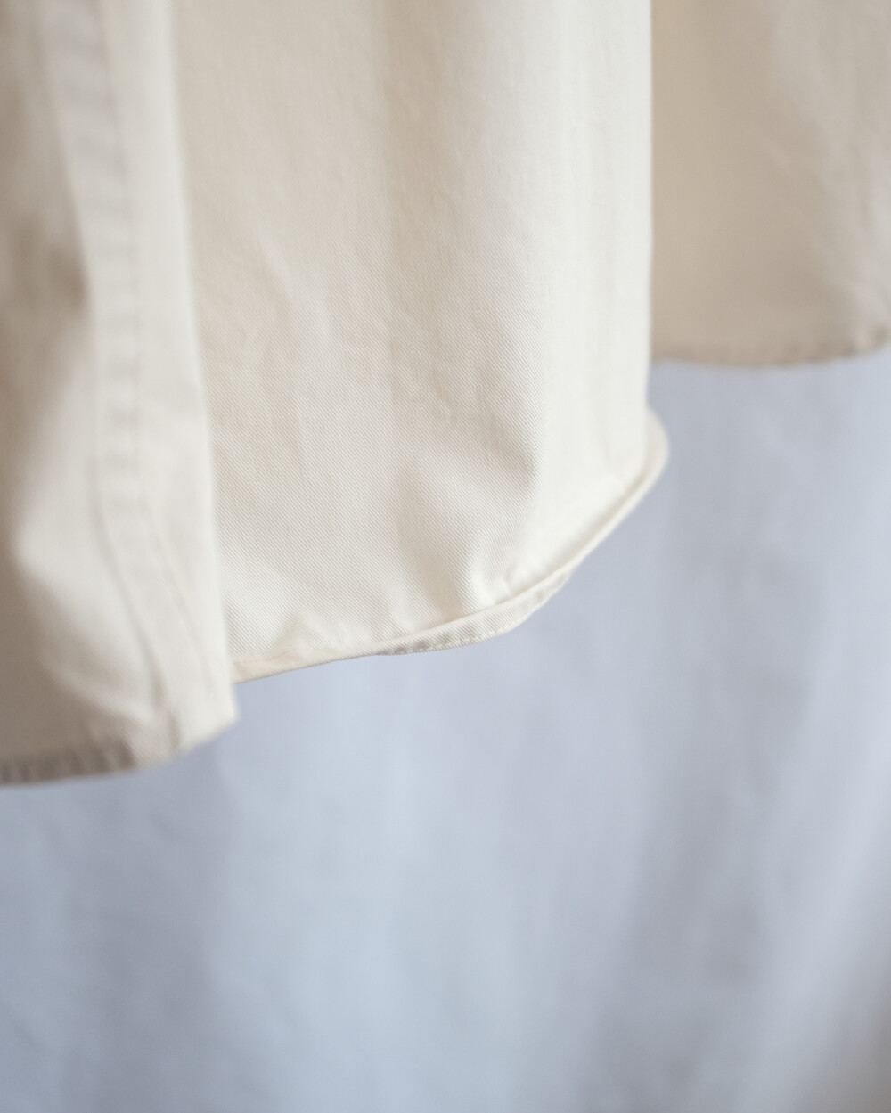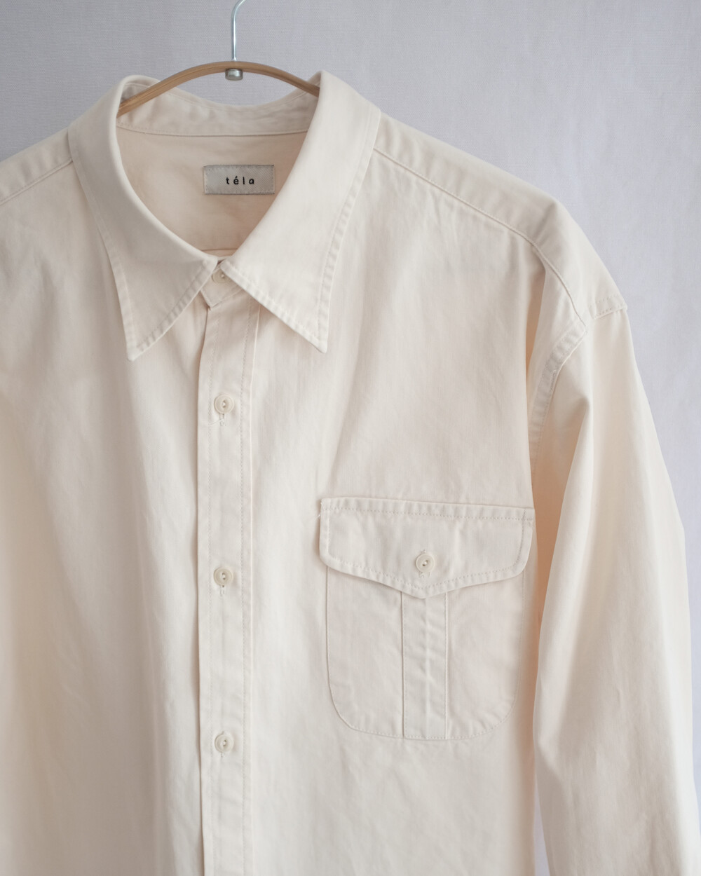 주로 재킷이나 팬츠에 쓰이는 밀도 높은 트윌 코튼 원단을 사용했으며 제작 후 가공을 통한 소재 특유의 빈티지한 색감과 퍼커링 등 자연스러운 텍스처를 느끼실 수 있습니다. 천연 너트 소재의 단추를 염색하여 캐주얼한 분위기를 더하였고 가슴에 위치한 플랩 포켓과 너무 좁지 않은 유려한 칼라의 형태는 뗄라만의 깔끔하면서도 절제된 디자인을 돋보여줍니다.