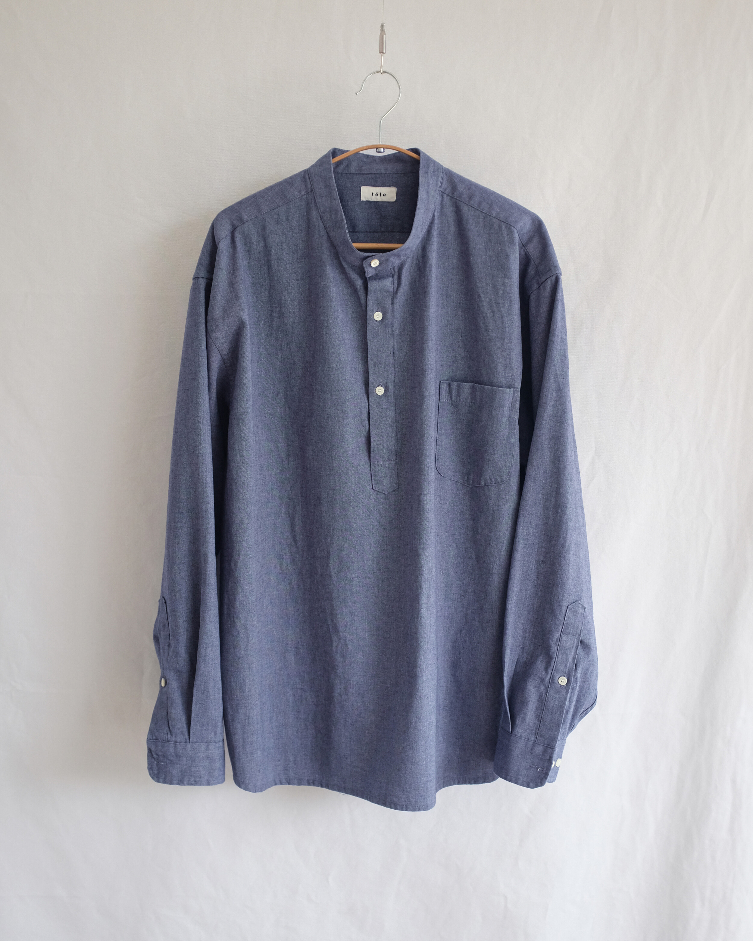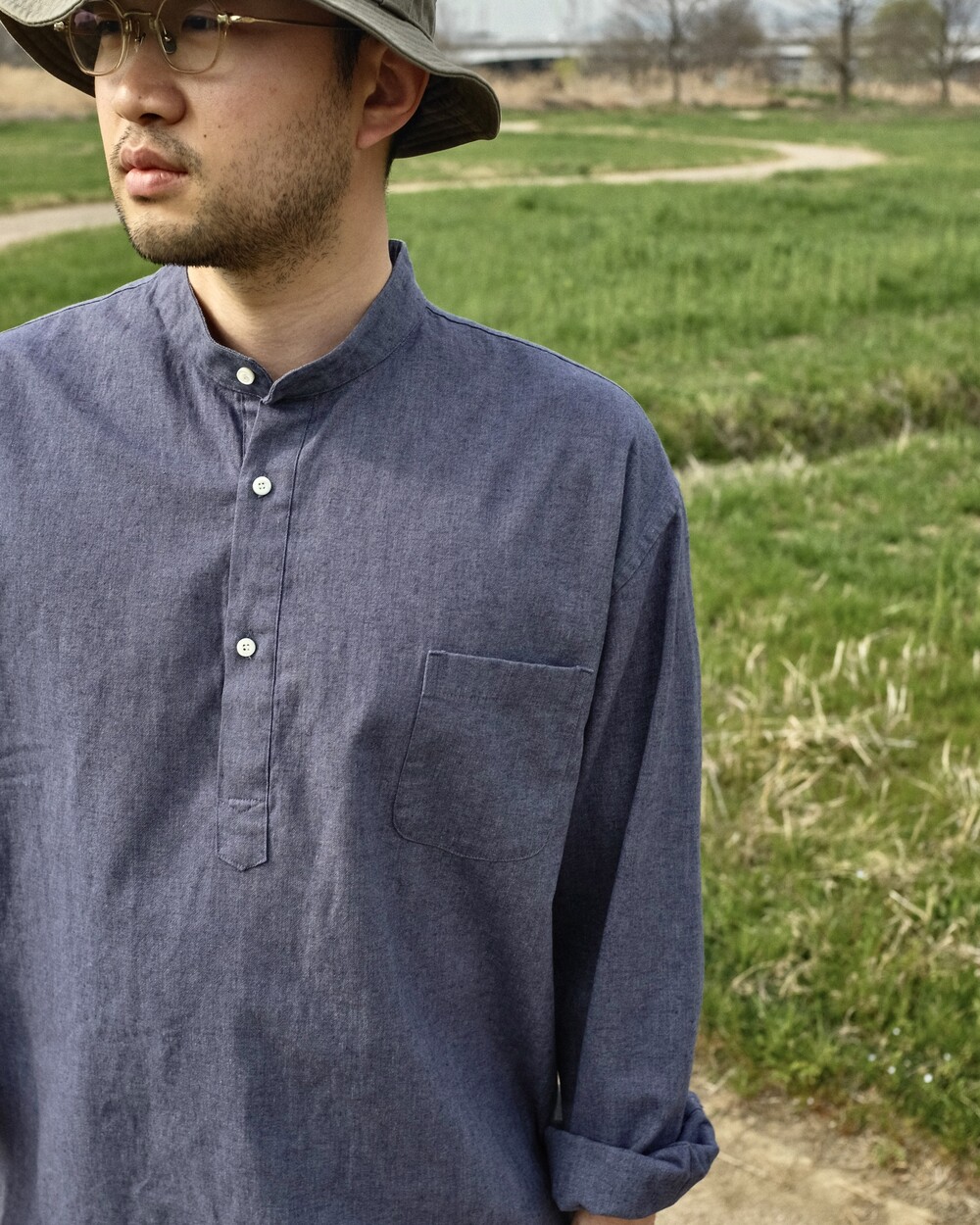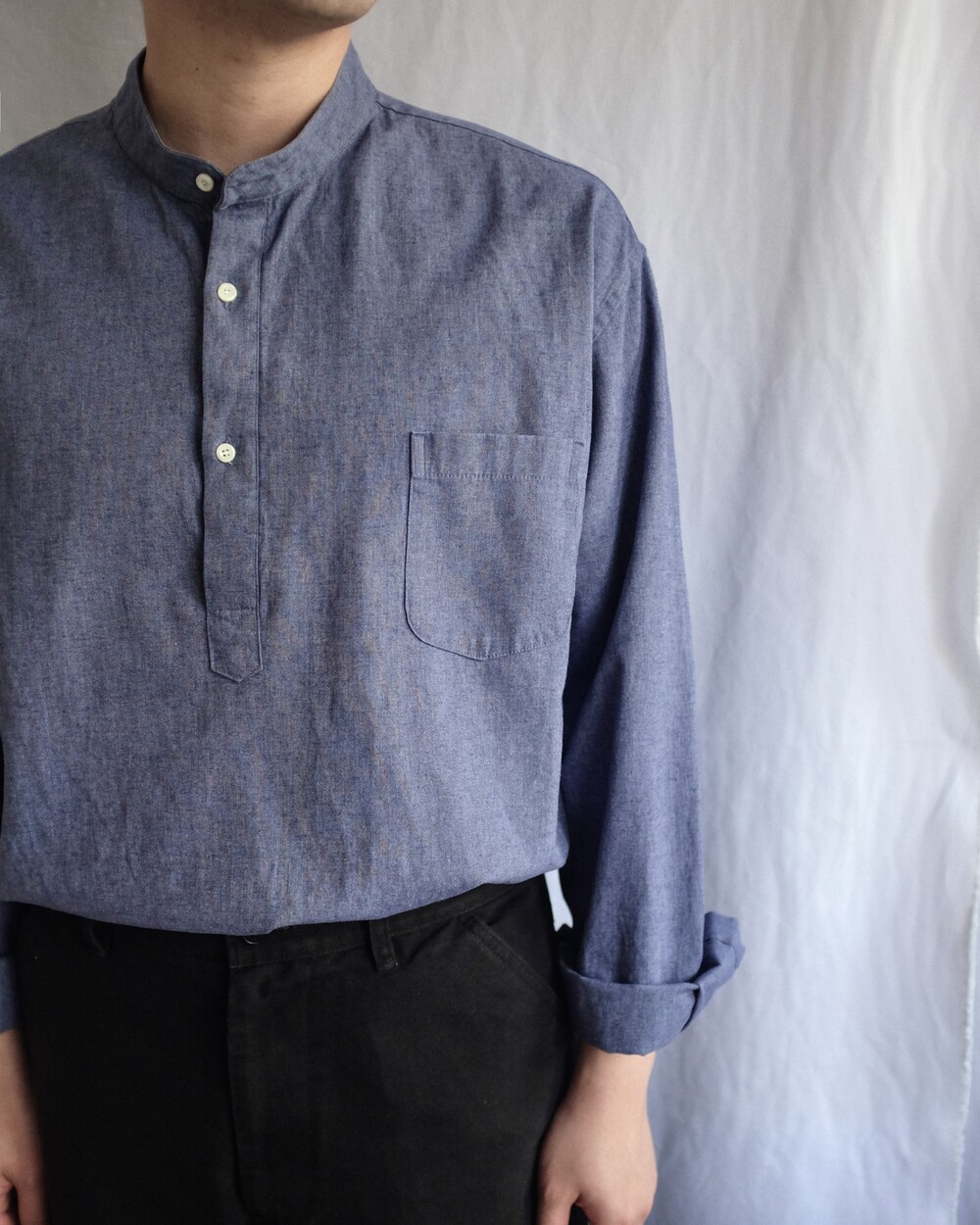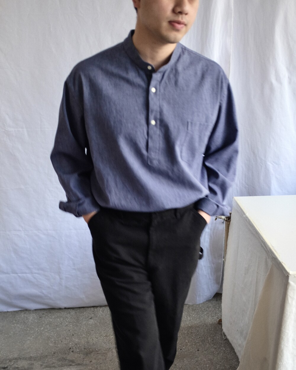 군더더기 없이 깔끔한 밴디드 카라 디자인의 ‘풀오버 셔츠(Pullover Shirt)’입니다.